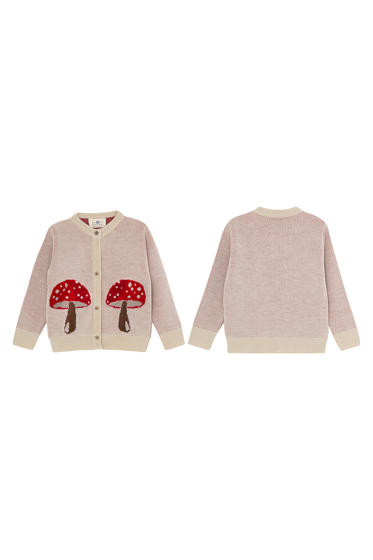 Cárdigan infantil tejido de algodón suave, en tono beige claro con diseño frontal de hongos rojas con lunares blancos, ideal para niñas y niños. Prenda cómoda, cálida y transpirable, perfecta para días frescos. Cuenta con cierre de botones frontal, puños, cuello y basta en rib para un mejor ajuste y durabilidad. Su diseño tierno y original combina fácilmente con vestidos, jeans, leggings o faldas, convirtiéndolo en una prenda versátil para uso diario, colegio o paseos. Cárdigan unisex de alta calidad, resistente al lavado, ideal para regalos y para acompañar las aventuras de los más pequeños.