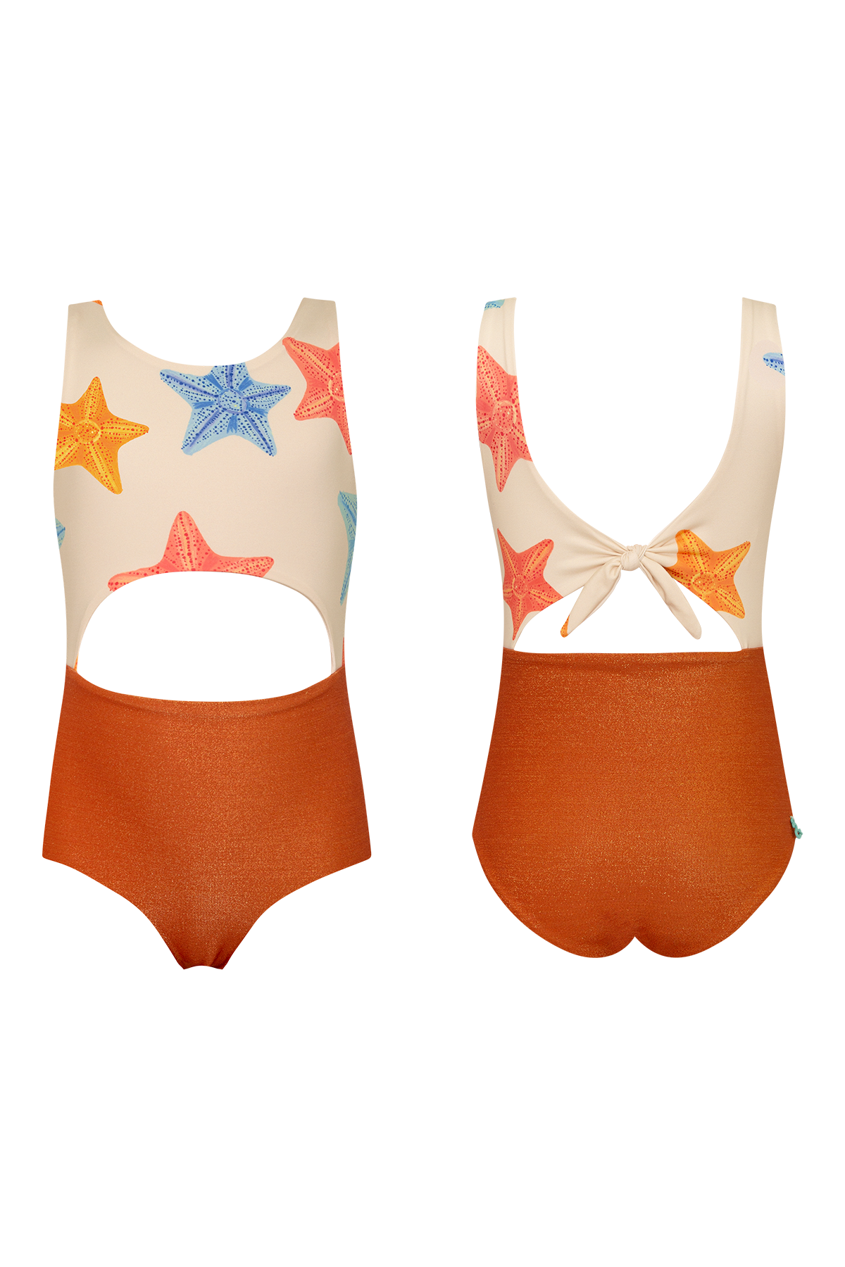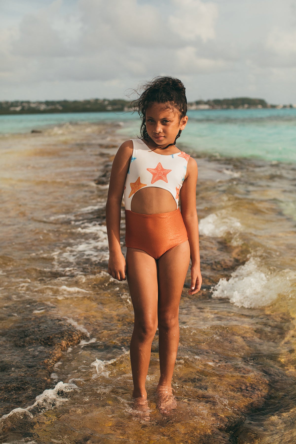 Vestido de baño trikini con corte redondo en cintura, espalda escotada ajustable con nudo. La tela tiene factor de protección UPF50+ lo que quiere decir que actua como un escudo protector contra los rayos UV del sol. Hecho en Colombia
