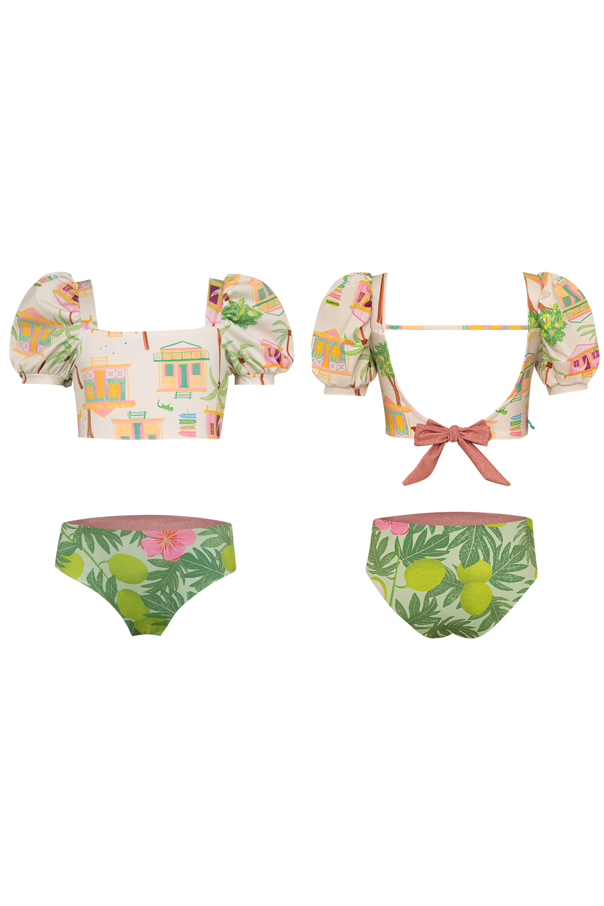 Bikini con manga corta bombacha y calzón reversible. La tela tiene factor de protección UPF50+ lo que quiere decir que actua como un escudo protector contra los rayos UV del sol. Hecho en Colombia