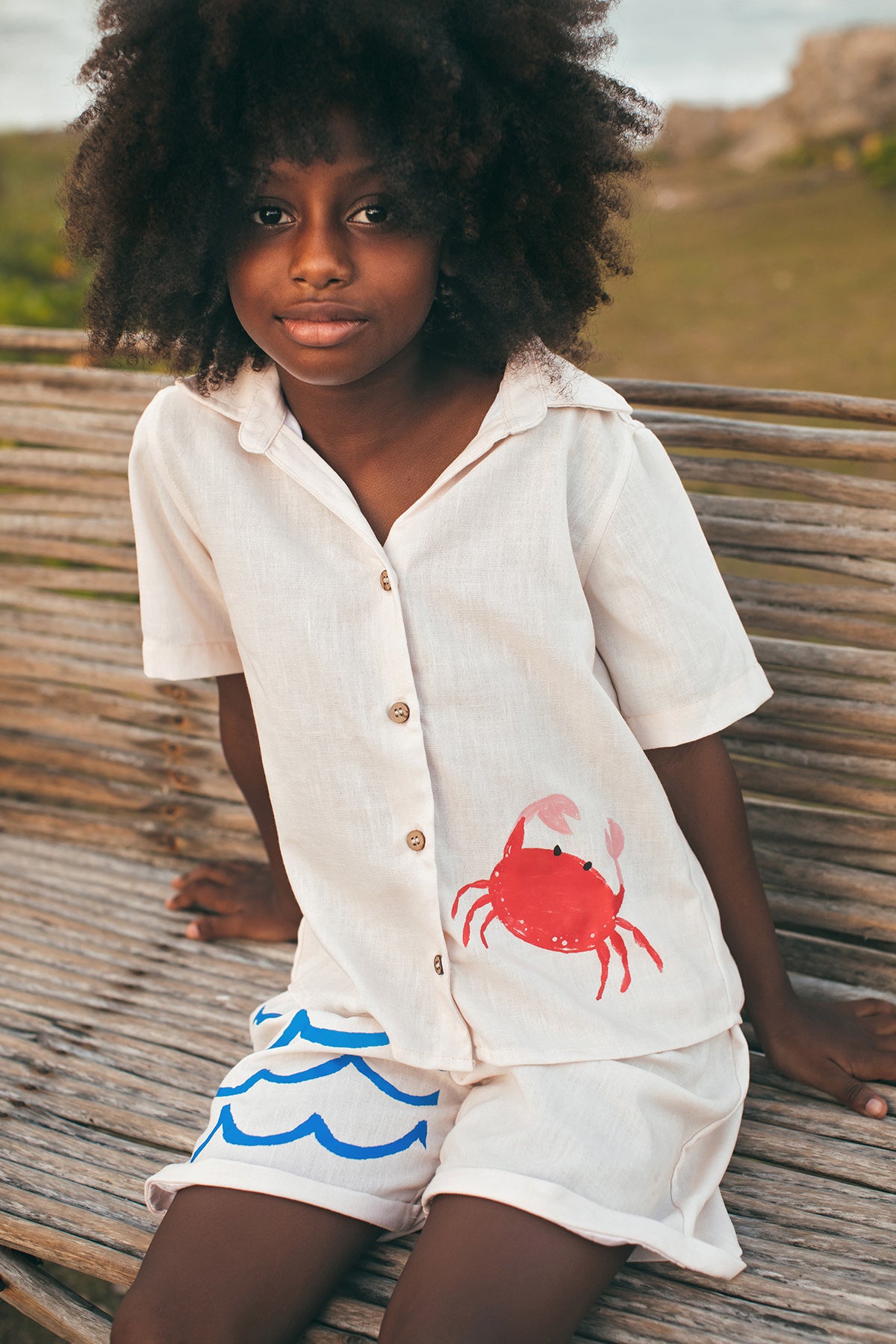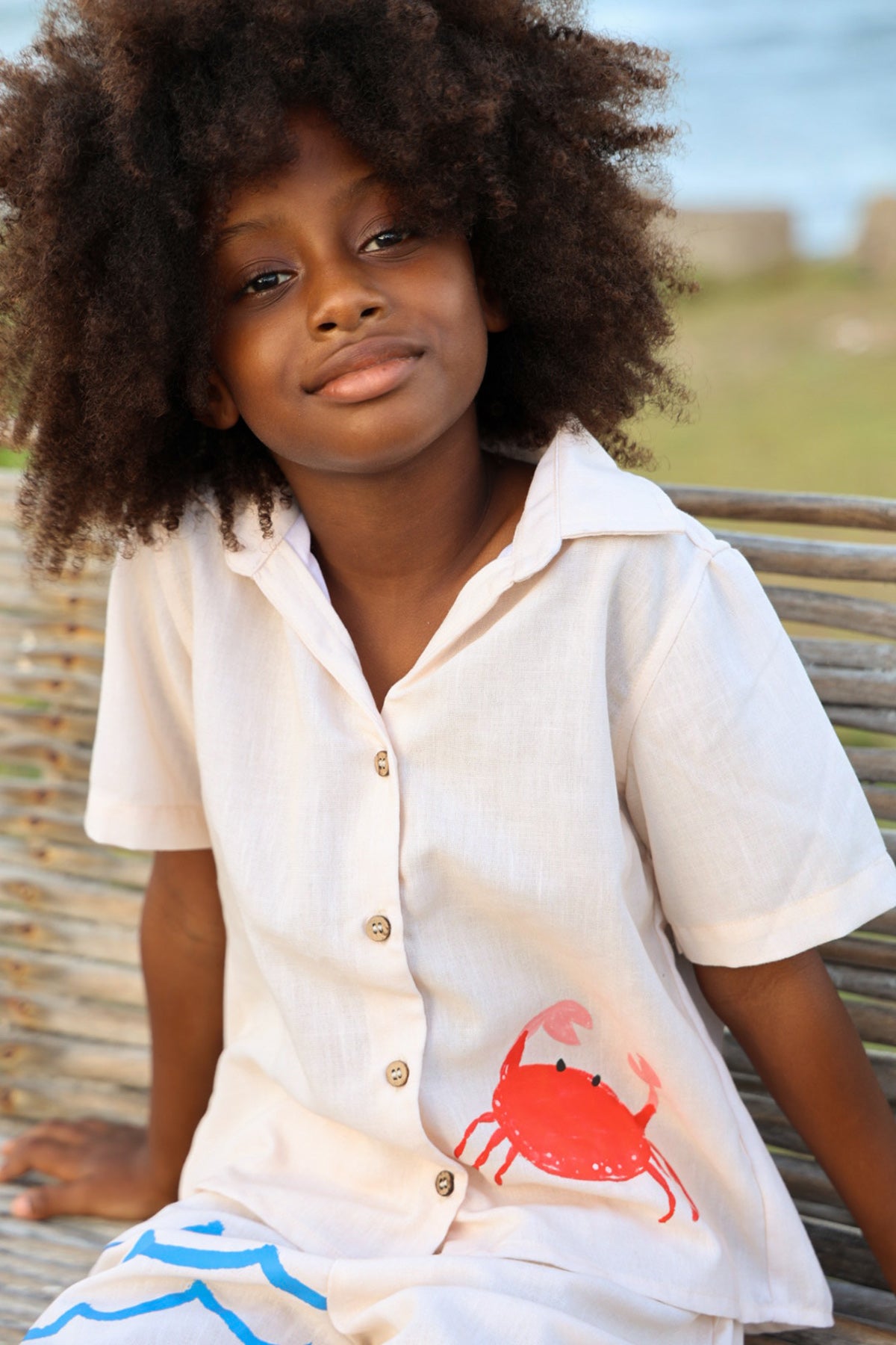 Camisa estilo guayabera de manga corta para niños, elaborada en 100% algodón orgánico. Cuenta con cierre frontal con botones, bolsillo en el pecho y un estampado de cangrejo rojo en el frente. Diseñada con un corte relajado y tela fresca y transpirable para uso cómodo diario.