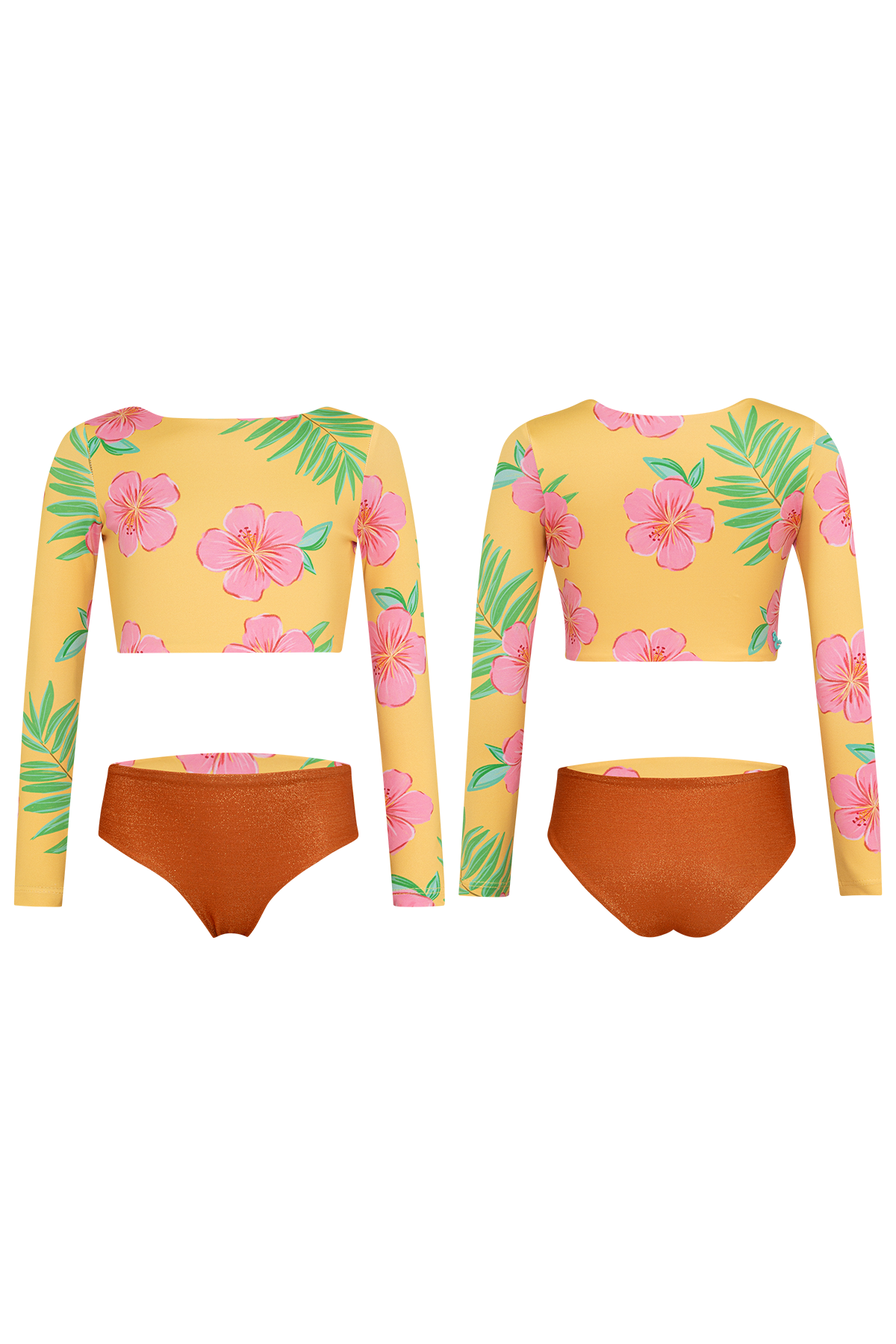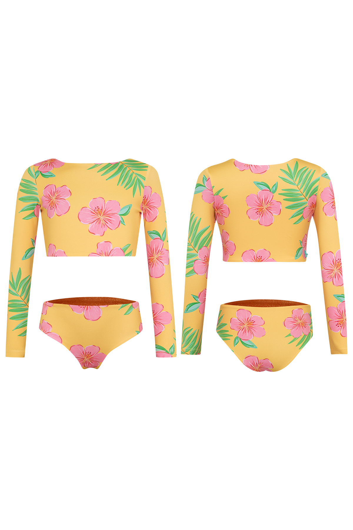 Bikini con top manga larga y calzón reversible. La tela tiene factor de protección UPF50+ lo que quiere decir que actua como un escudo protector contra los rayos UV del sol. Hecho en Colombia