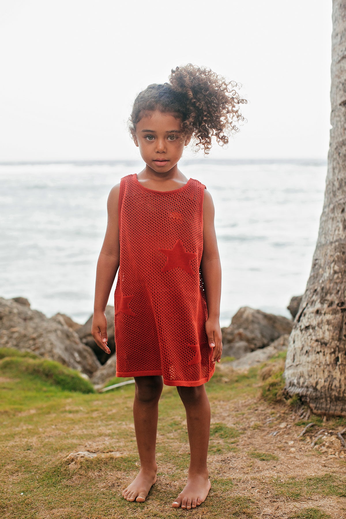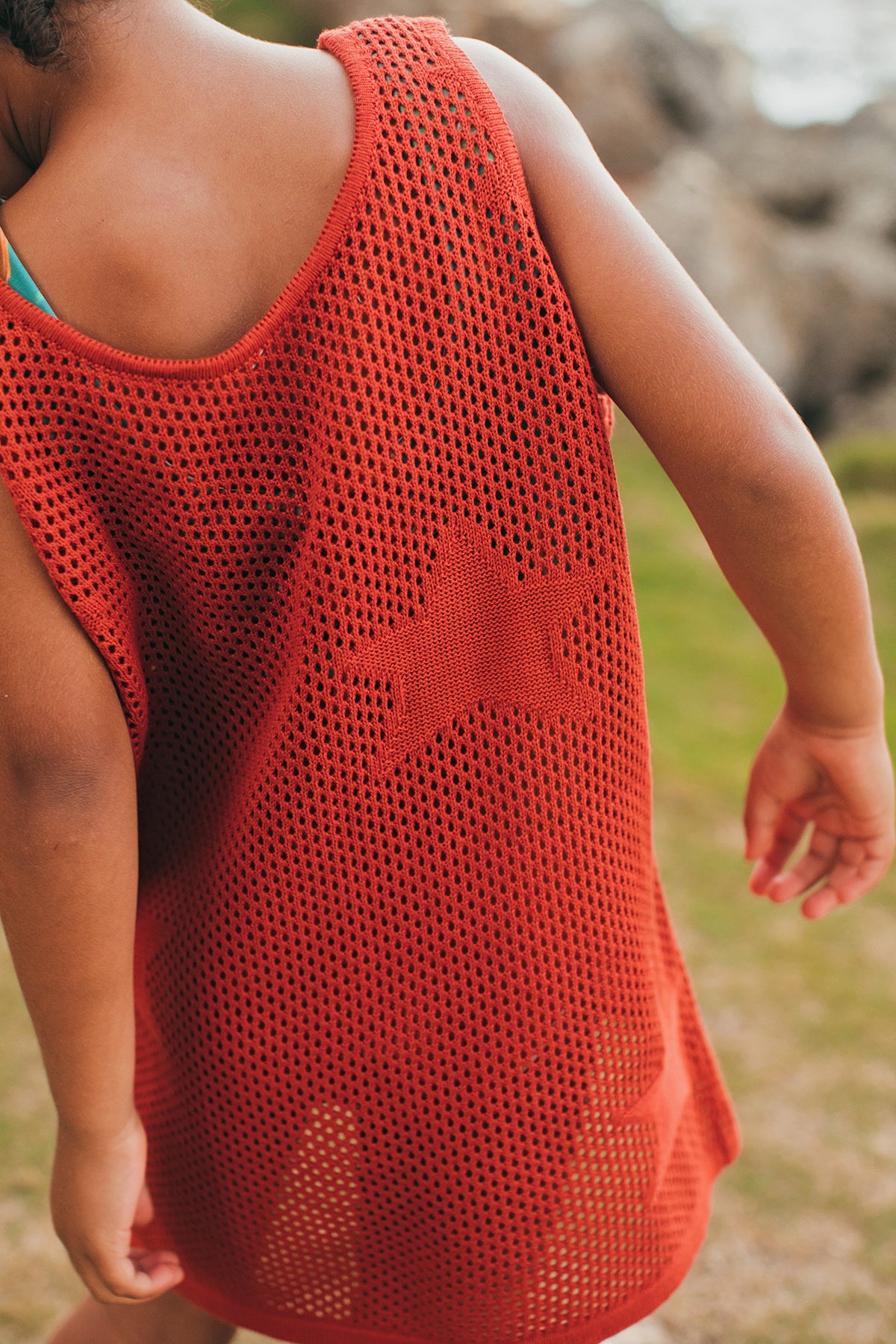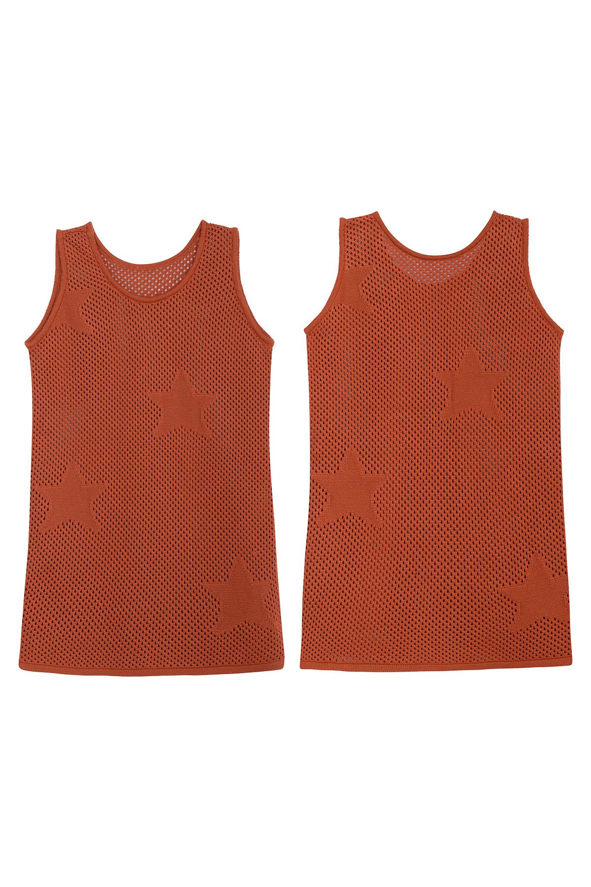 Confeccionado en tejido de punto calado con textura perforada y diseño de estrellas integradas en el tejido. Cuenta con escote redondo y silueta recta para un ajuste cómodo.