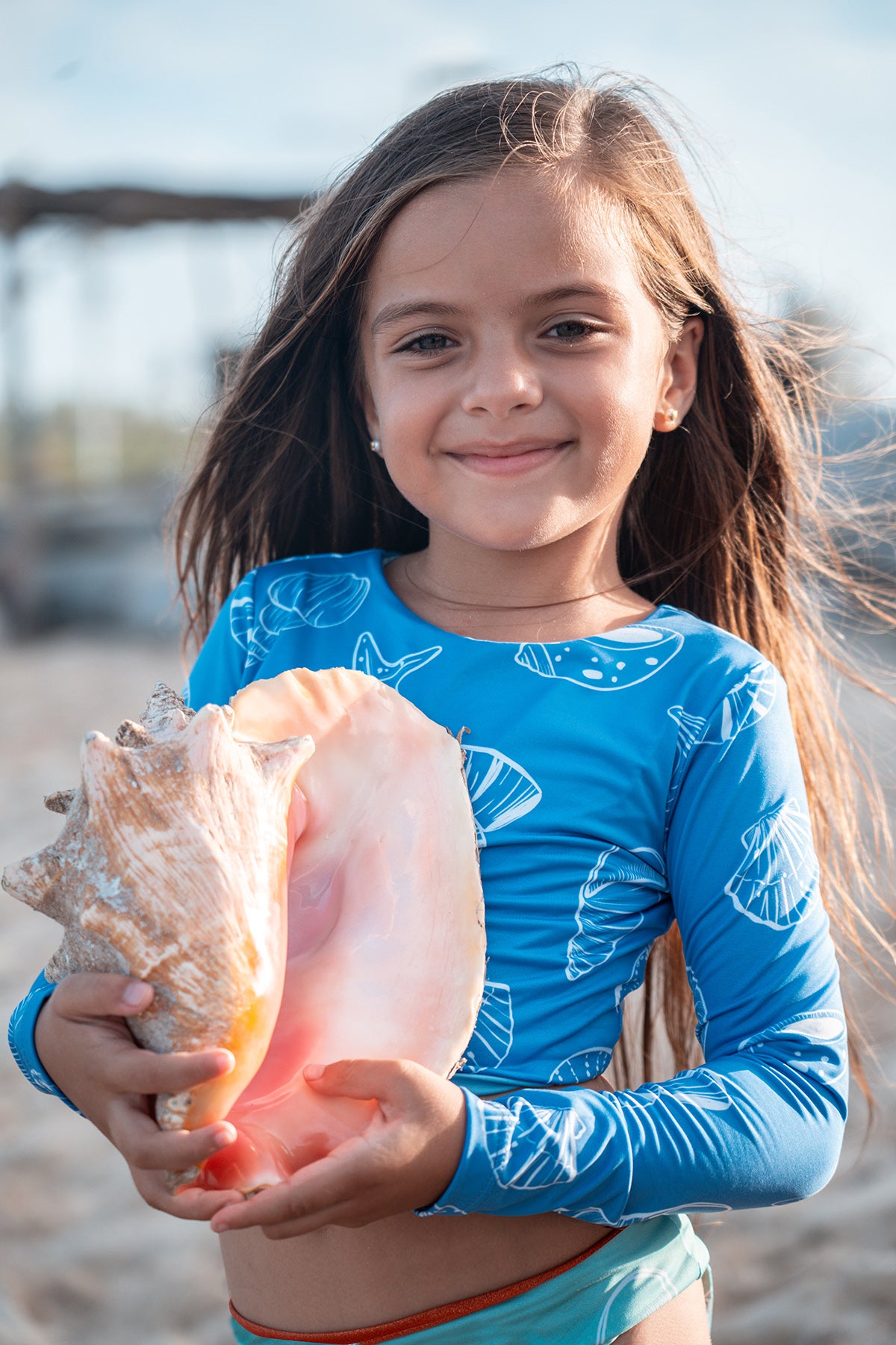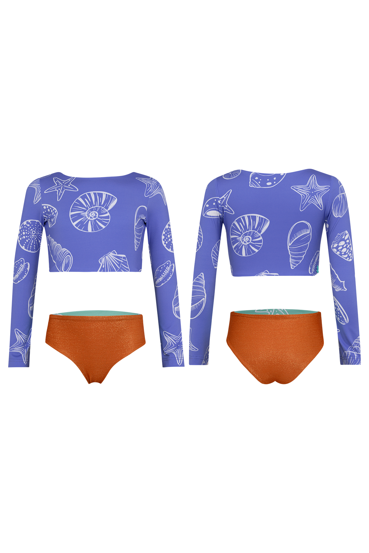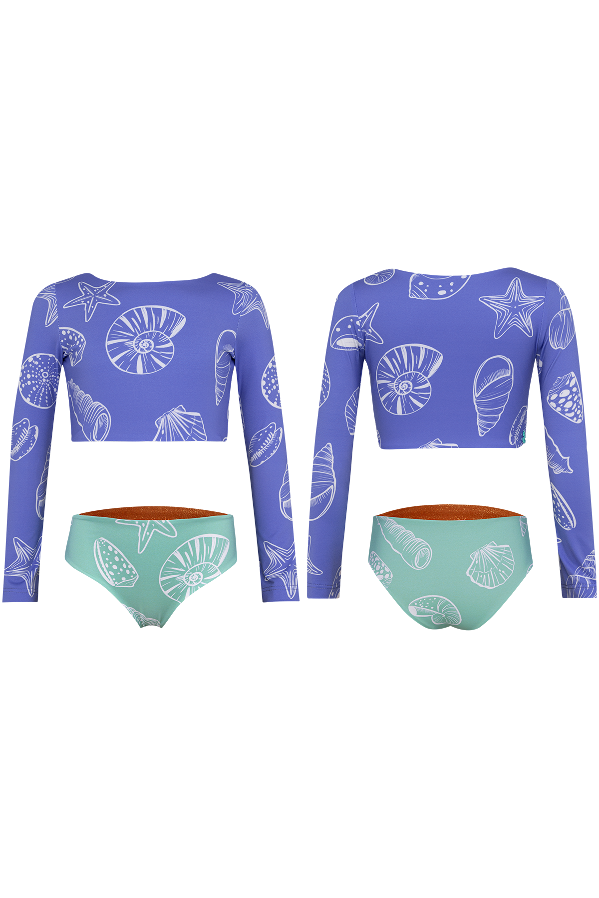 Bikini con top manga larga y calzón reversible. La tela tiene factor de protección UPF50+ lo que quiere decir que actua como un escudo protector contra los rayos UV del sol. Hecho en Colombia