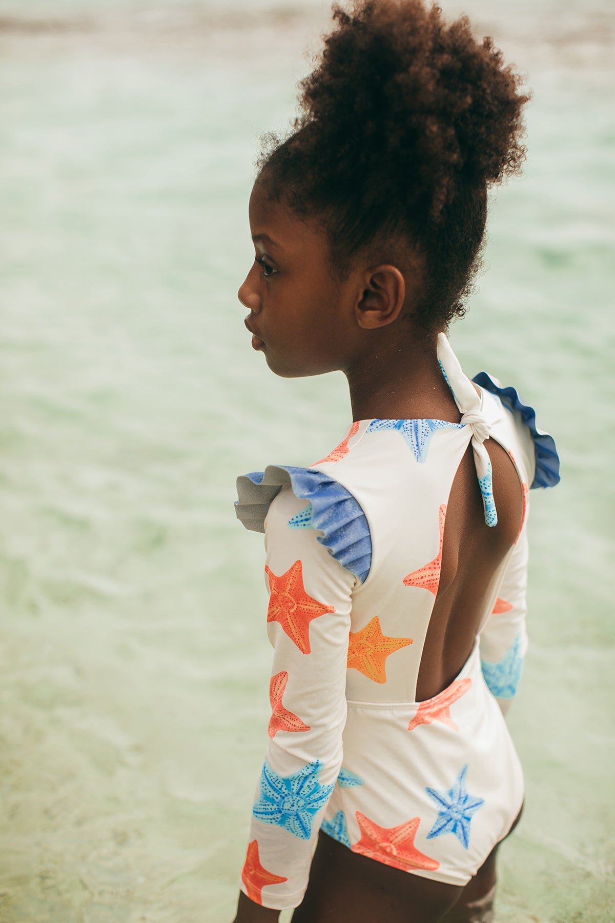 Vestido de baño enterizo manga larga para protección del sol con arandela en los hombros. La tela tiene factor de protección UPF50+ lo que quiere decir que actua como un escudo protector contra los rayos UV del sol. Hecho en Colombia