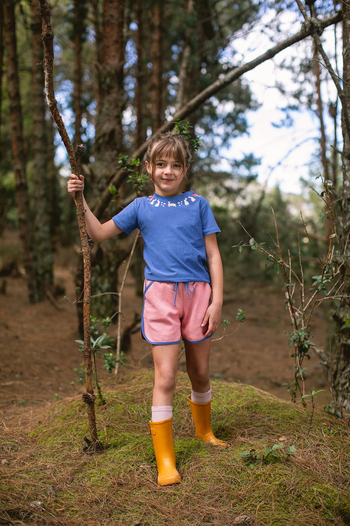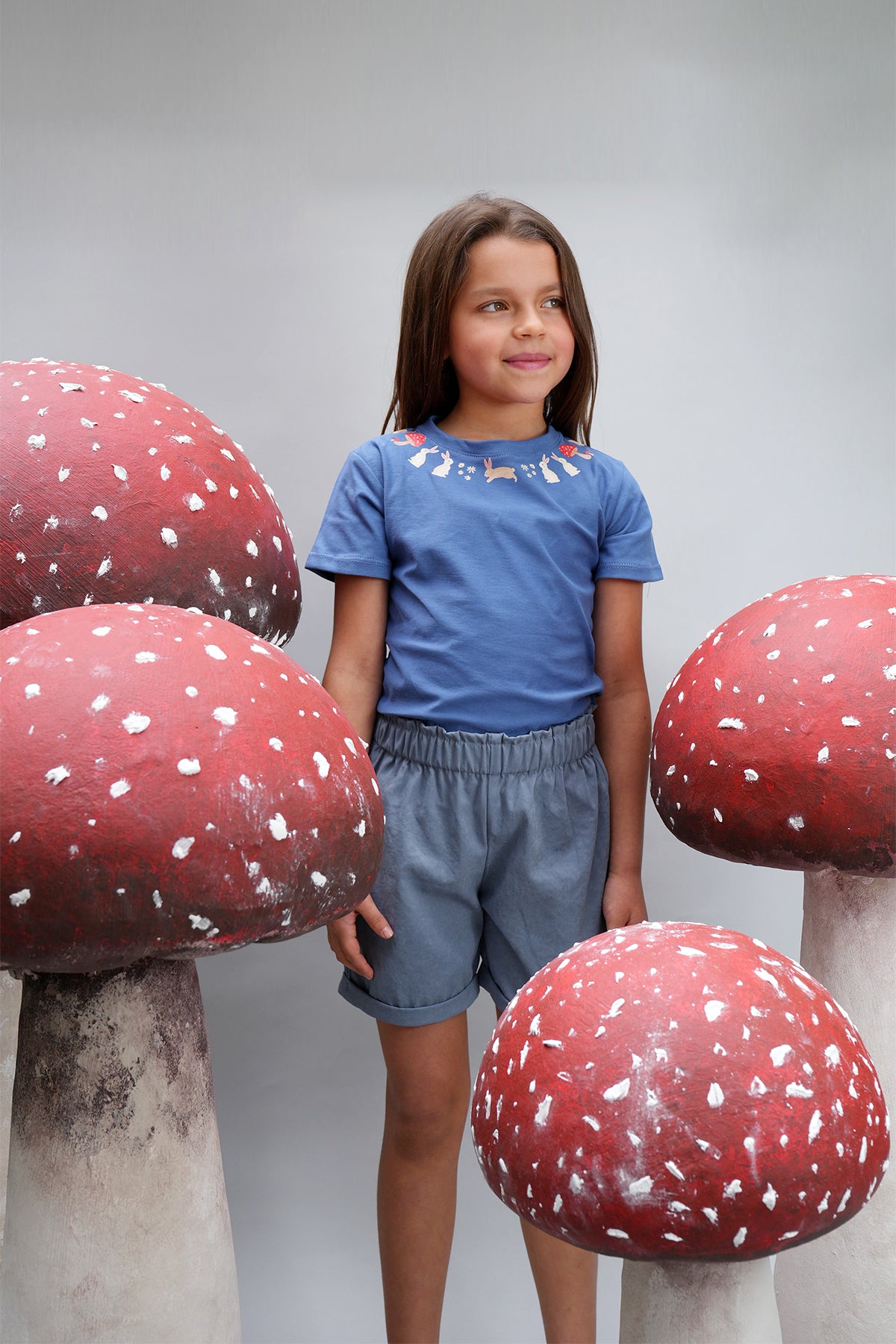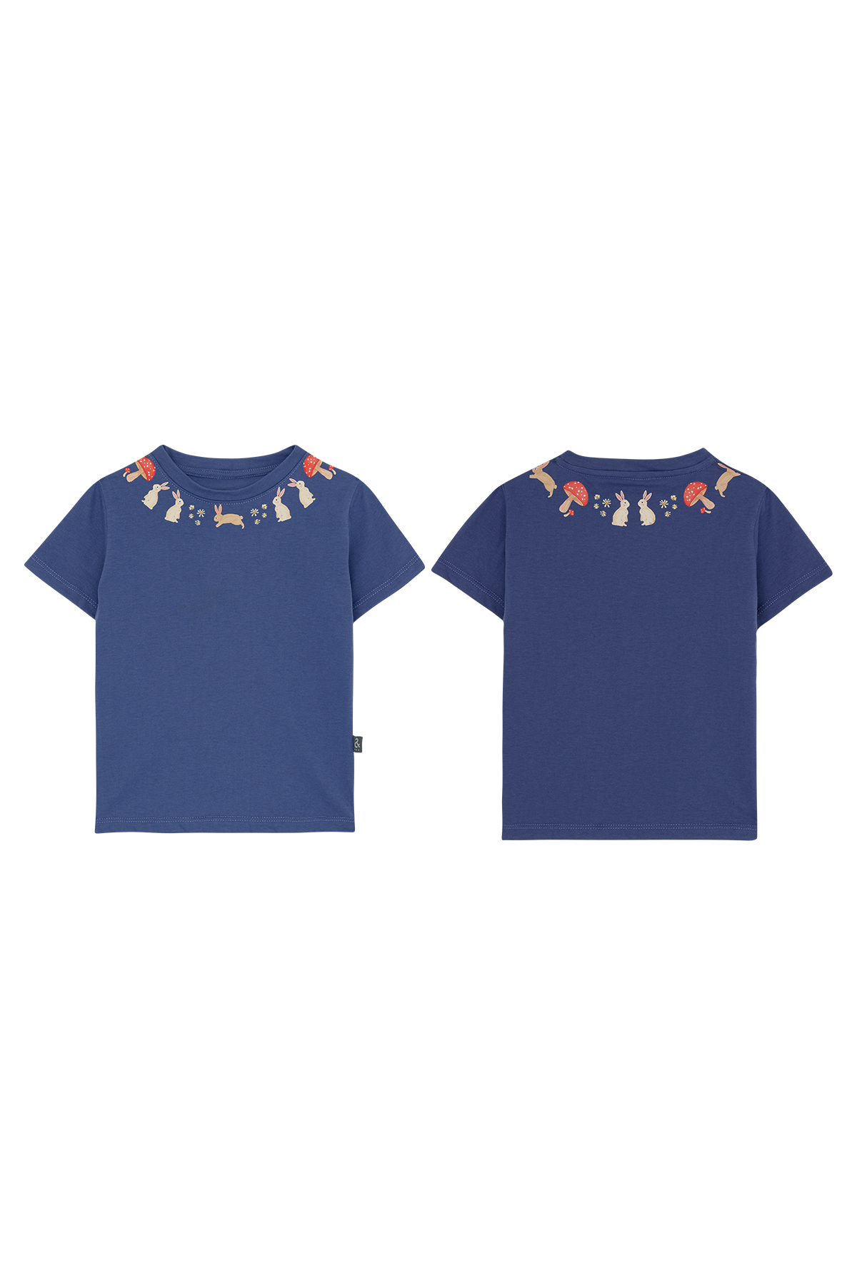 Camiseta infantil unisex de algodón suave, color azul, con estampado de conejos, hongos y flores alrededor del cuello. Prenda cómoda, transpirable y de alta calidad, perfecta para uso diario, colegio, paseos o actividades al aire libre. Ideal como regalo para niños, ropa casual o moda infantil.