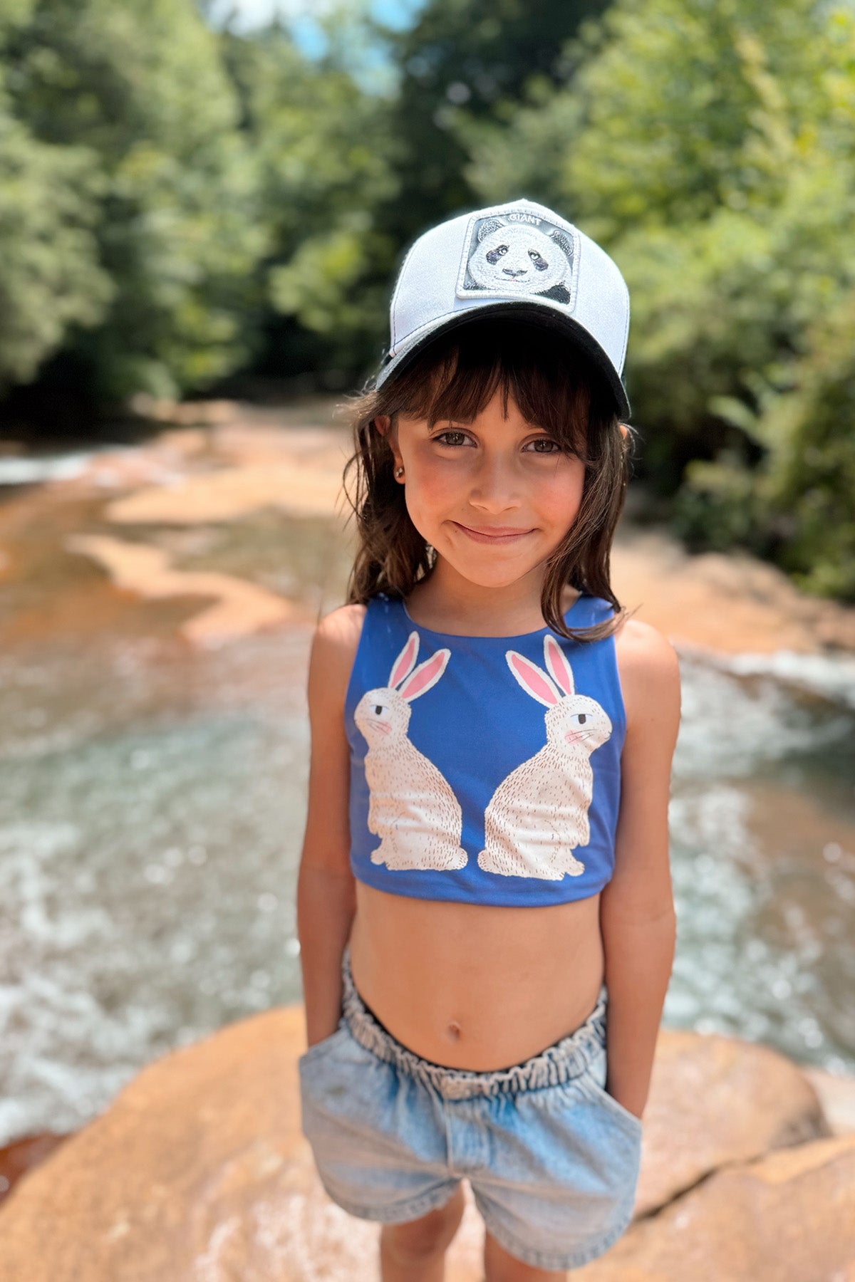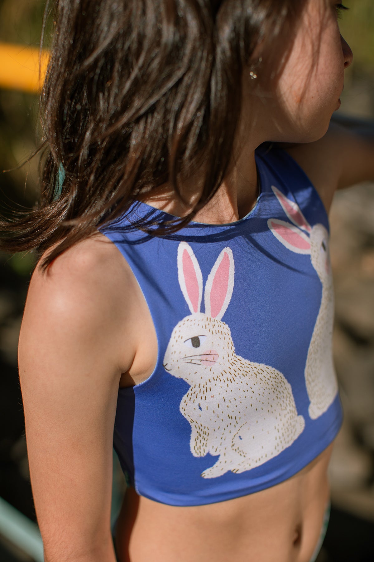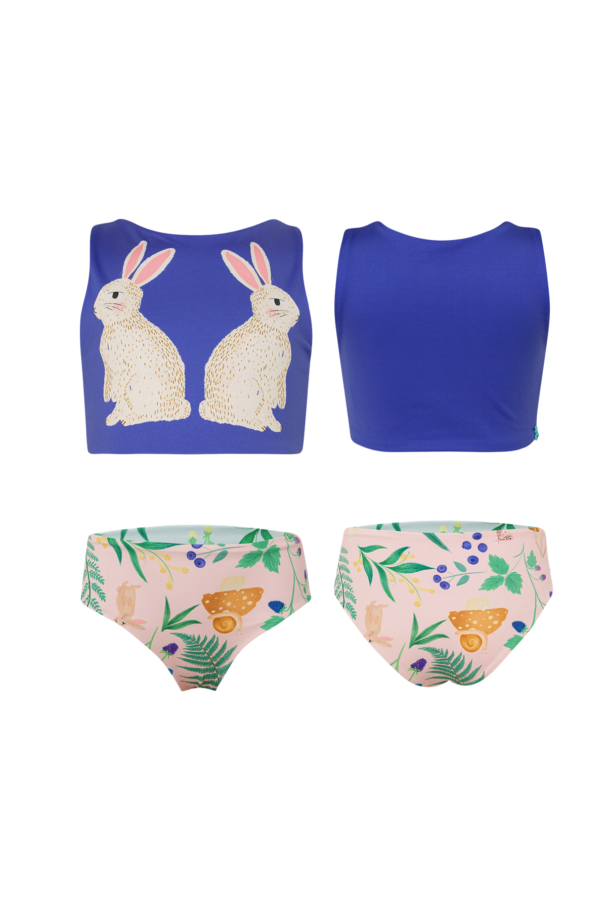 Bikini infantil de dos piezas para niña, diseñado para máxima comodidad y estilo en días de playa o piscina. Incluye un top básico cómodo con estampado en espejo de dos conejos, ideal para quienes buscan un diseño original. El calzón es reversible, ofreciendo dos opciones de uso en una sola prenda, perfecta para variar el look sin ocupar espacio extra en la maleta. Confeccionado en tela suave, elástica y de secado rápido, resistente al cloro y a la sal, manteniendo los colores vivos por más tiempo.