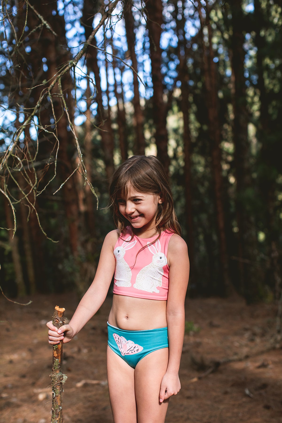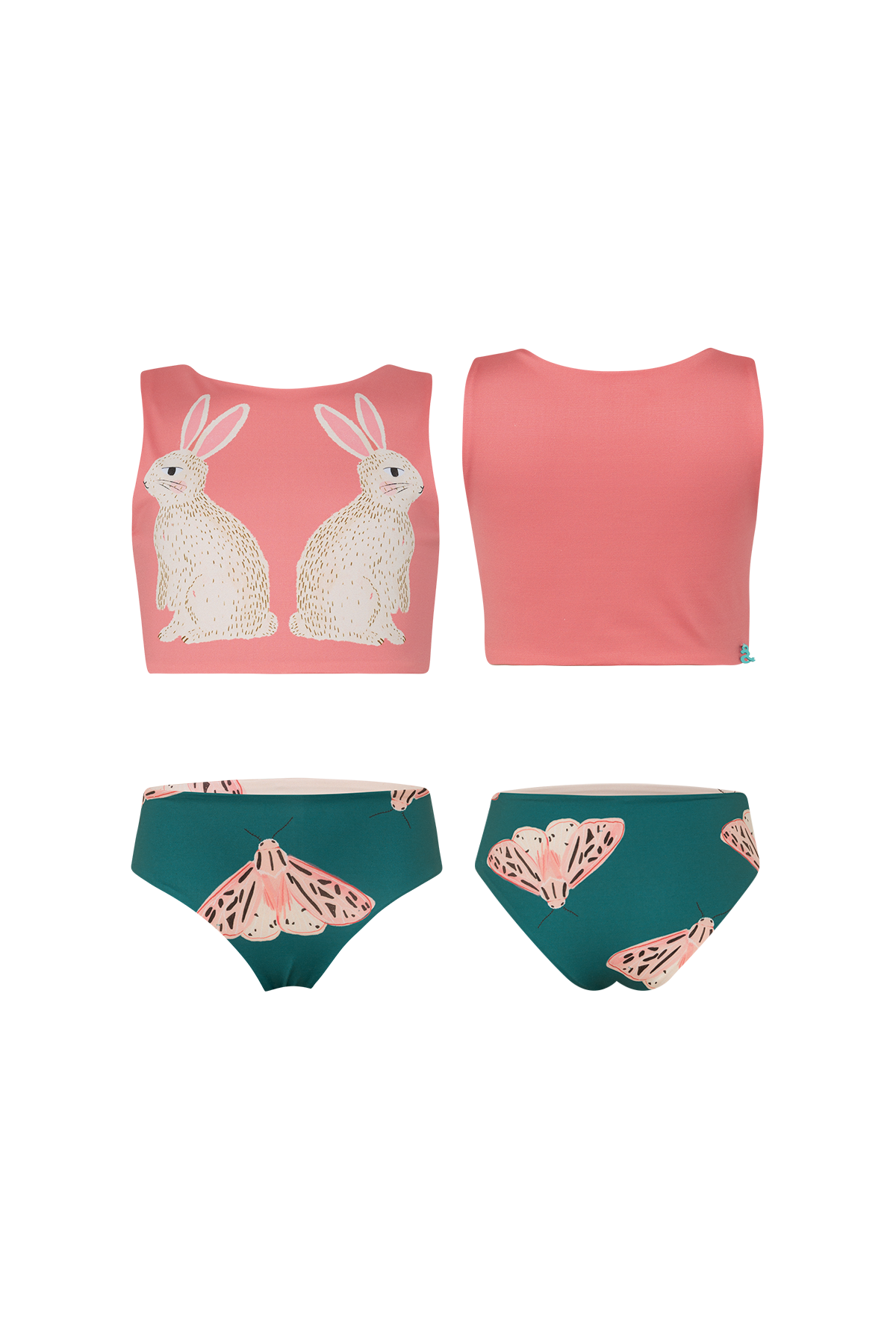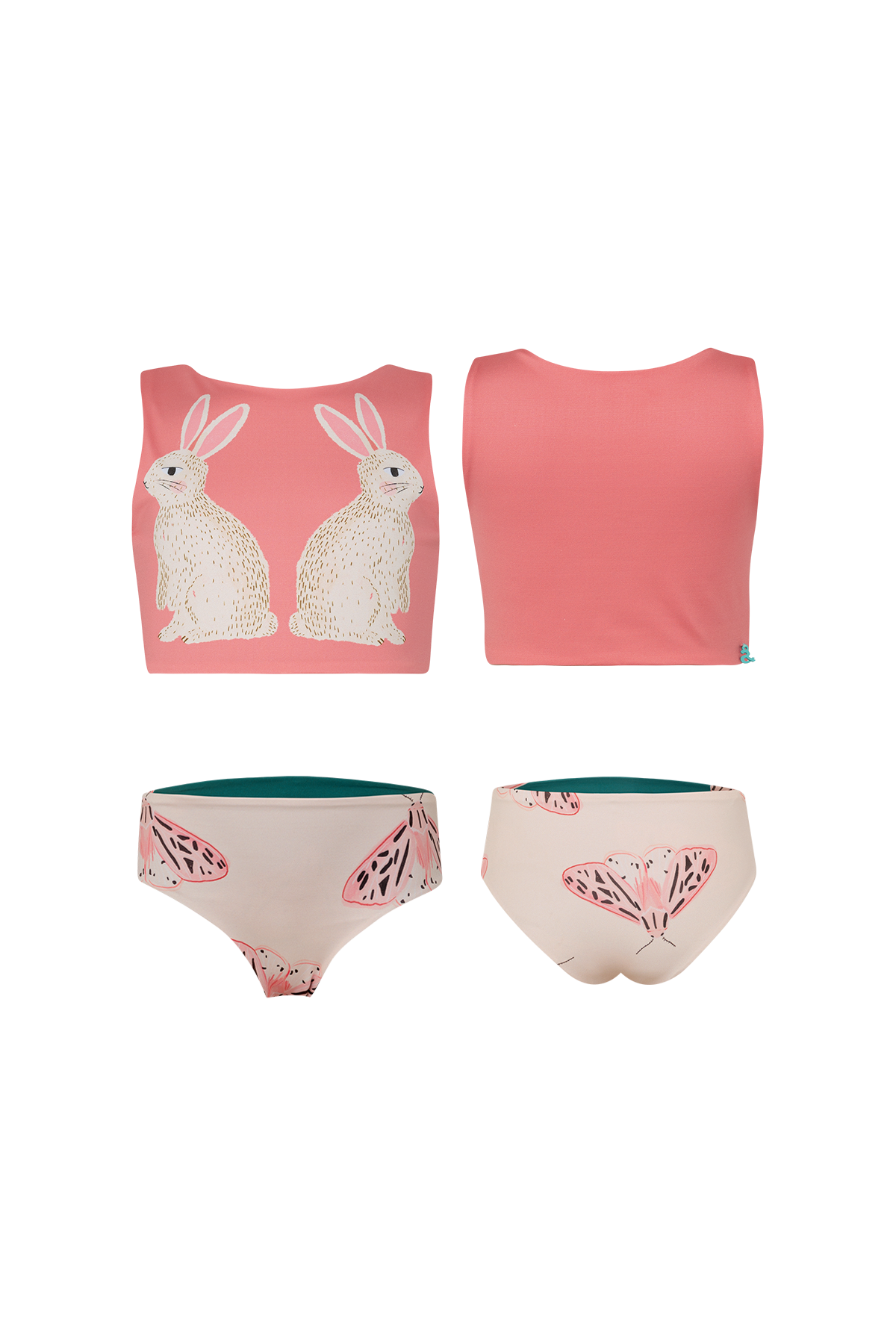 Bikini infantil de dos piezas para niña, diseñado para máxima comodidad y estilo en días de playa o piscina. Incluye un top básico cómodo con estampado en espejo de dos conejos, ideal para quienes buscan un diseño original. El calzón es reversible, ofreciendo dos opciones de uso en una sola prenda, perfecta para variar el look sin ocupar espacio extra en la maleta. Confeccionado en tela suave, elástica y de secado rápido, resistente al cloro y a la sal, manteniendo los colores vivos por más tiempo. Ideal como traje de baño infantil versátil, ropa de verano para vacaciones o como regalo para niñas.