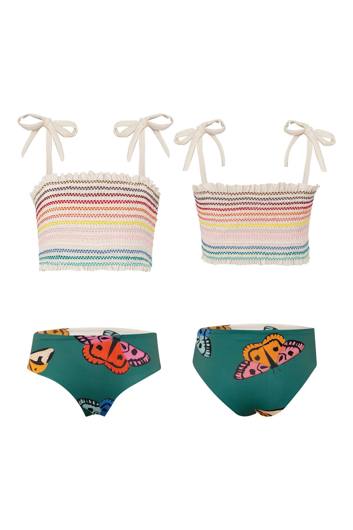 Polilla arcoiris crudo - waffle bikini es un traje de baño para niñas que combina comodidad, estilo y diversión bajo el sol. El diseño de polilla arcoiris crudo destaca por su top fruncido con tirantas ajustables, que permiten un ajuste perfecto y brindan libertad de movimiento para correr, nadar y jugar sin limitaciones. El calzón reversible del bikini polilla arcoiris crudo añade versatilidad, ofreciendo dos opciones de look en una sola prenda, lo que lo convierte en una opción práctica y divertida para cambiar de estilo según la ocasión.