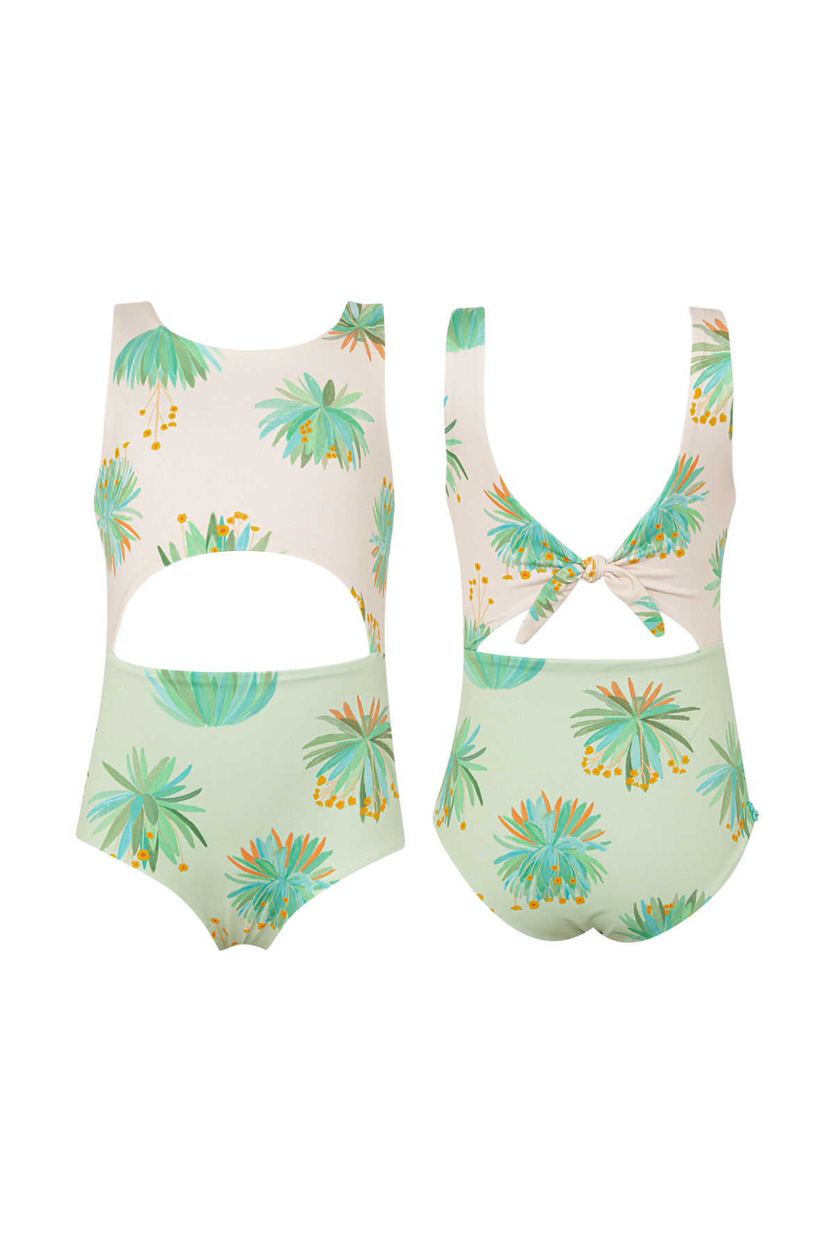 Vestido de baño trikini con corte redondo en cintura, espalda escotada ajustable con nudo. La tela tiene factor de protección UPF50+ lo que quiere decir que actua como un escudo protector contra los rayos UV del sol. Hecho en Colombia