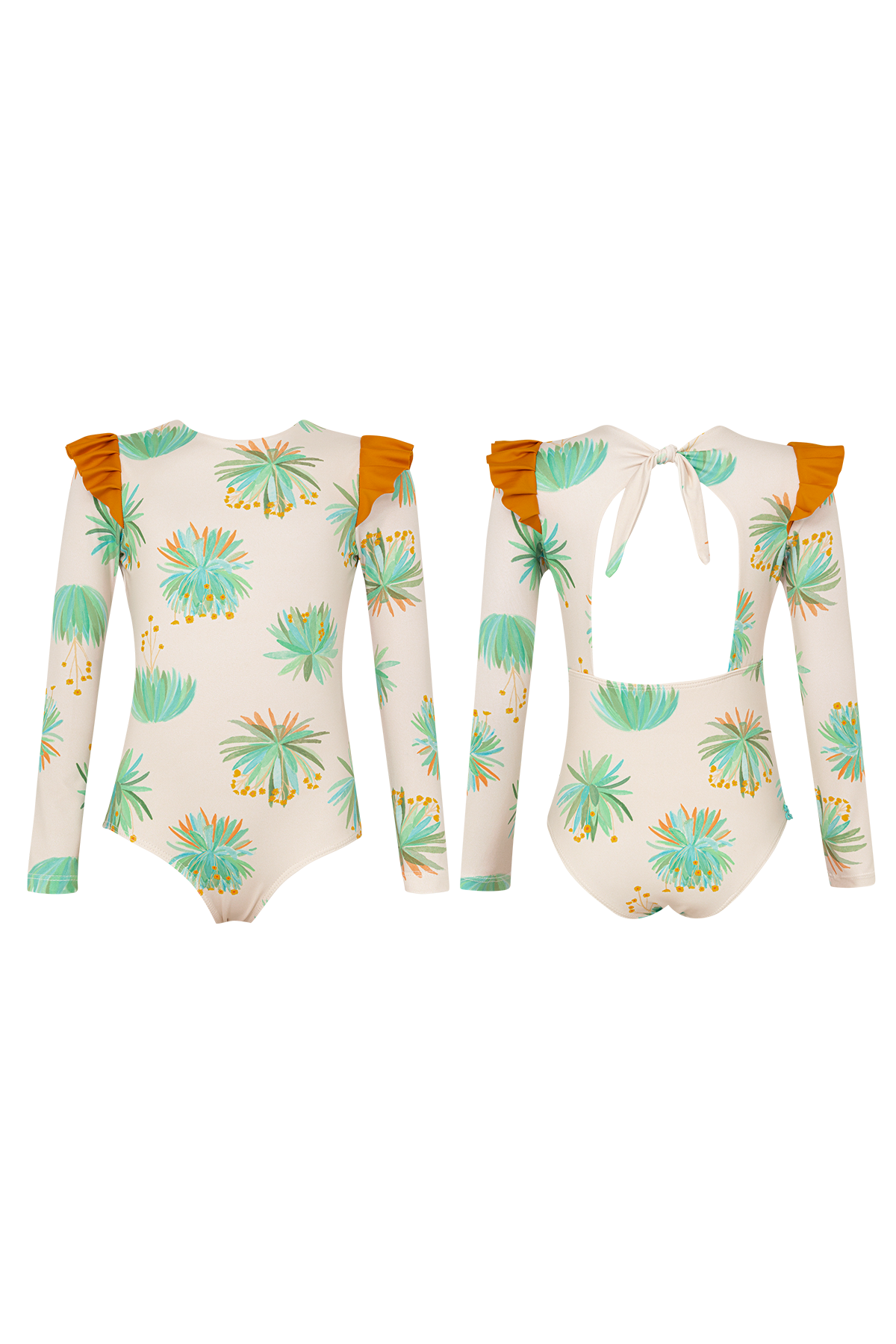 Vestido de baño enterizo manga larga para protección del sol con arandela en los hombros. La tela tiene factor de protección UPF50+ lo que quiere decir que actua como un escudo protector contra los rayos UV del sol. Hecho en Colombia