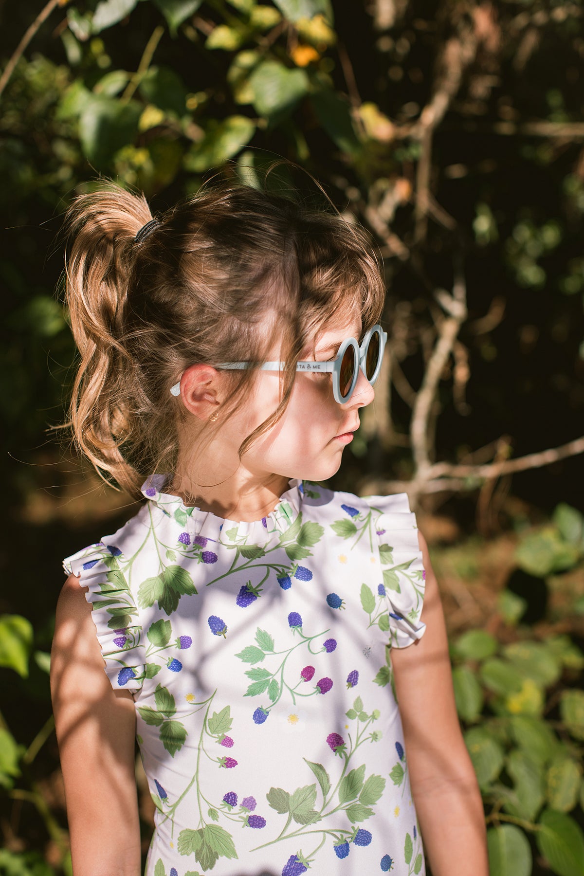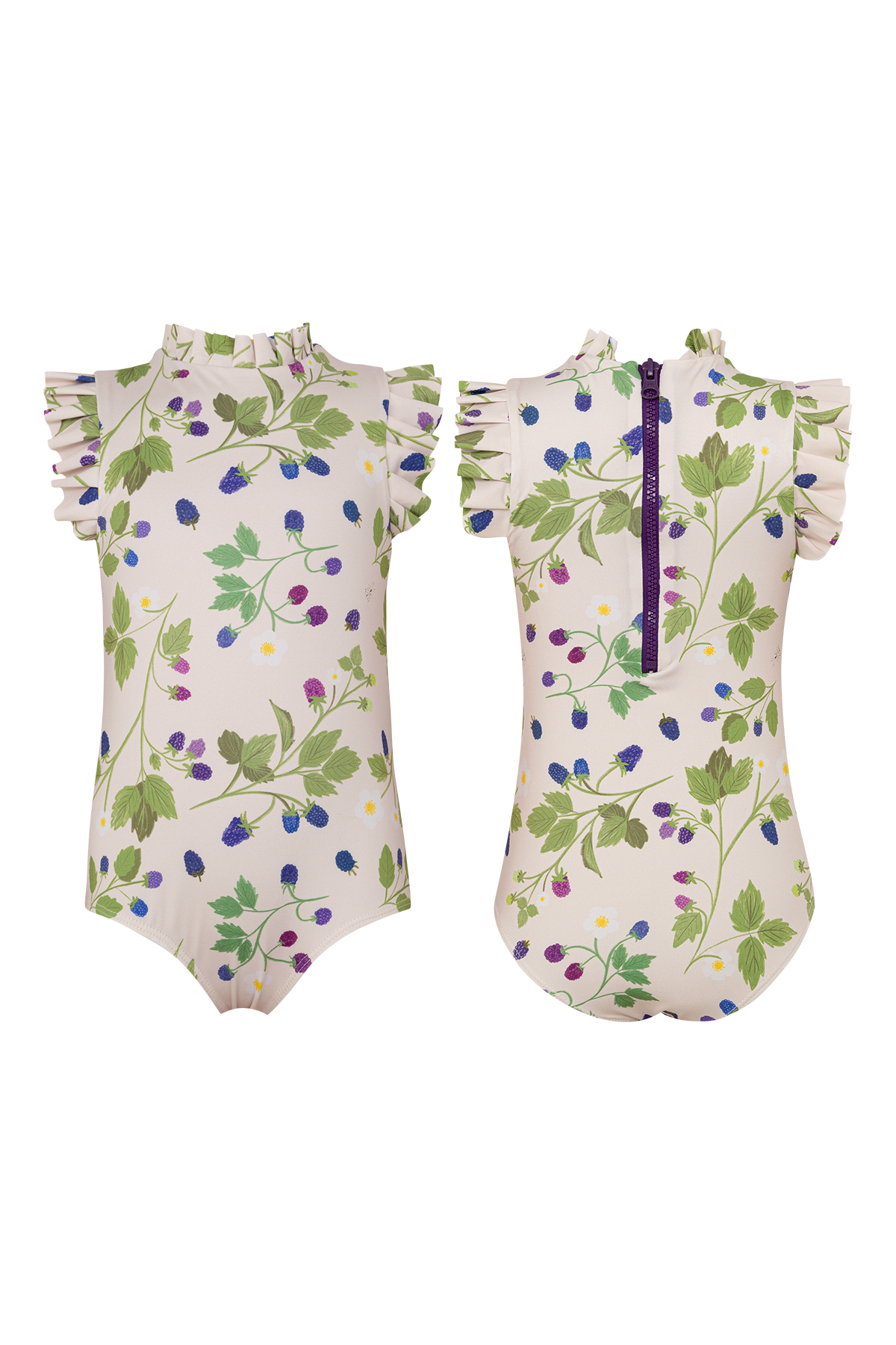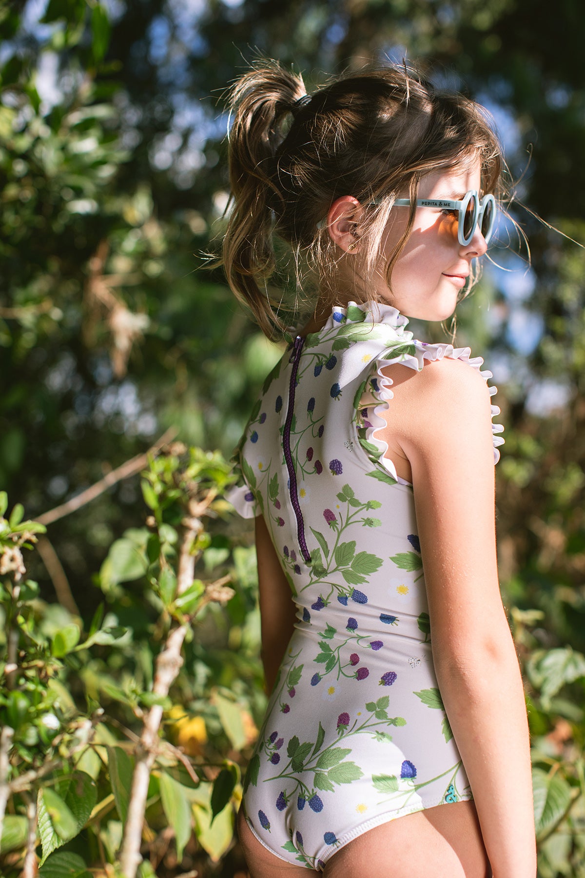 Vestido de baño enterizo manga corta con arandelas en escote y mangas y cremallera en la espalda. Hecho en Colombia