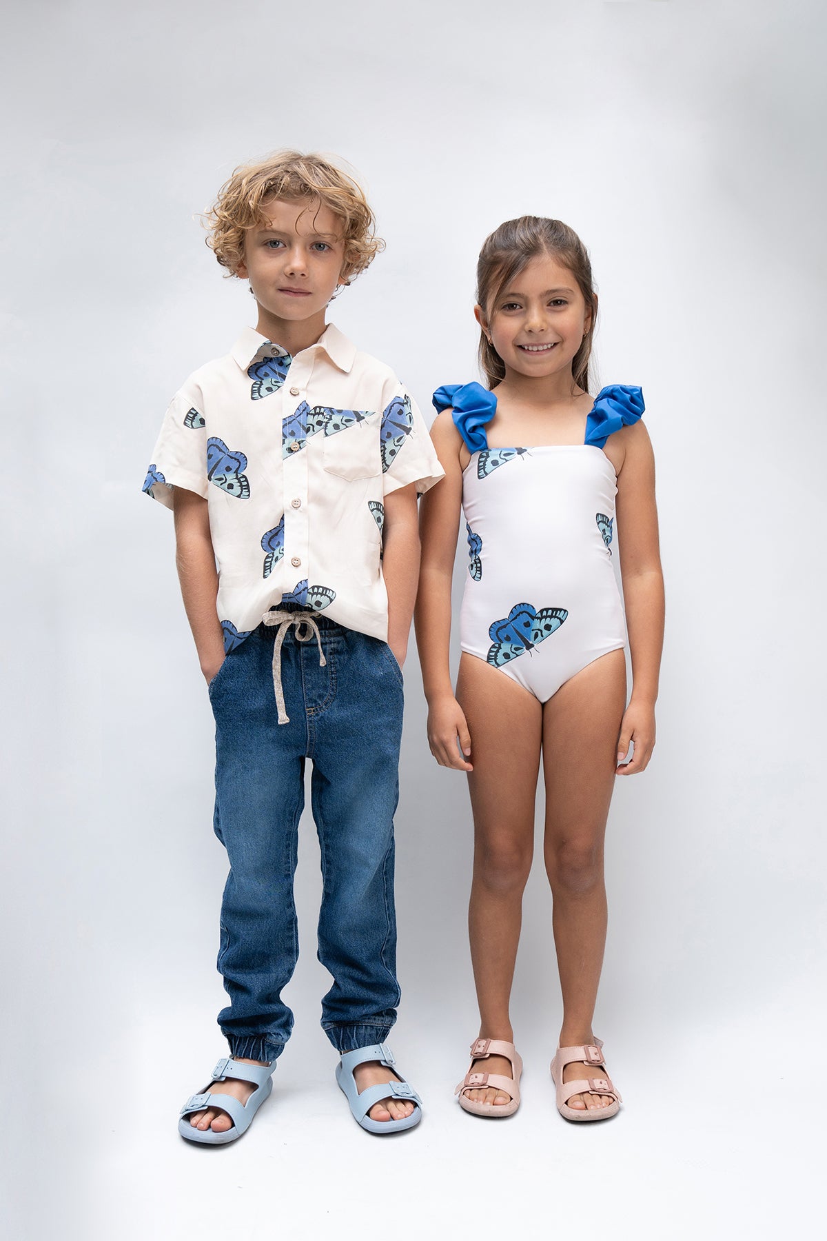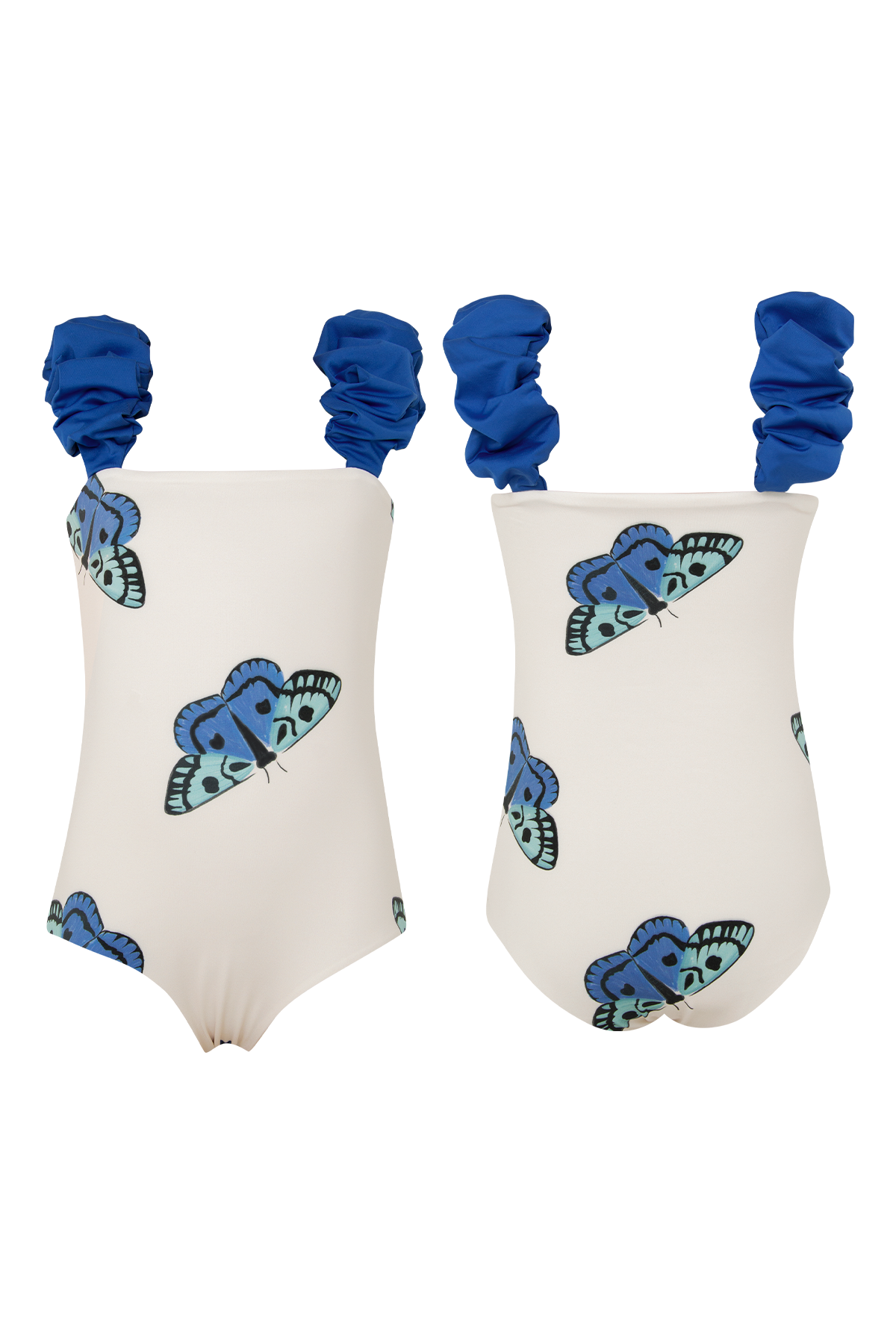 Vestido de baño enterizo de una pieza con llamativas tirantas bombachas. La tela tiene factor de protección UPF50+ lo que quiere decir que actua como un escudo protector contra los rayos UV del sol. Hecho en Colombia