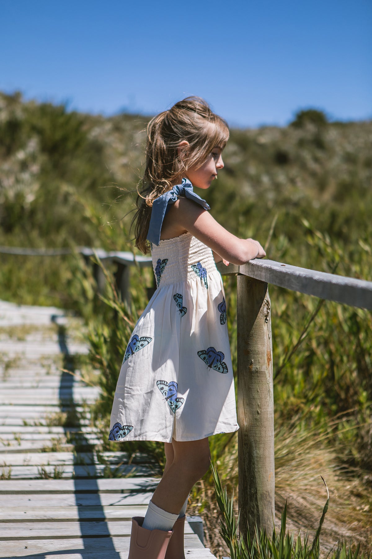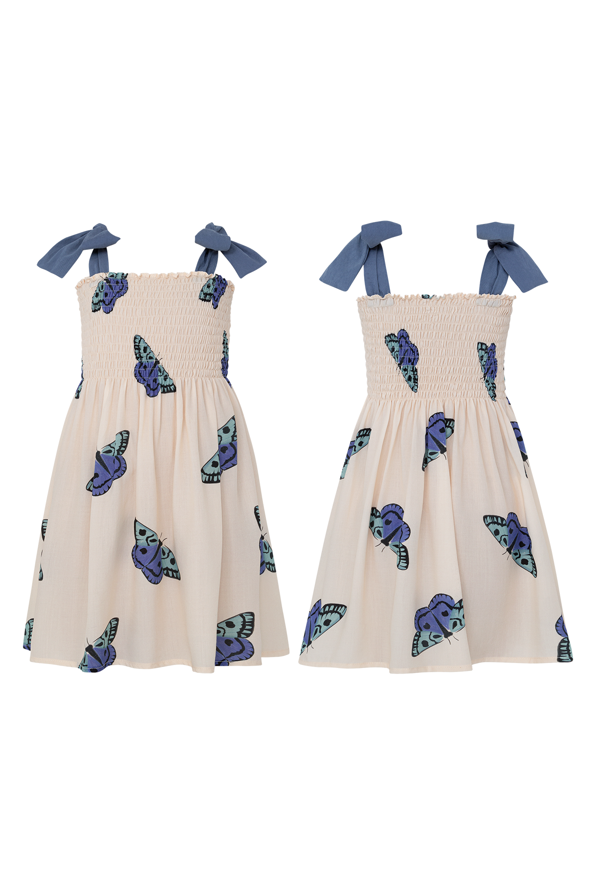 Vestido de playa corto con la parte de arriba fruncida y tirantas de amarrar en los hombros. Hecho en Colombia.