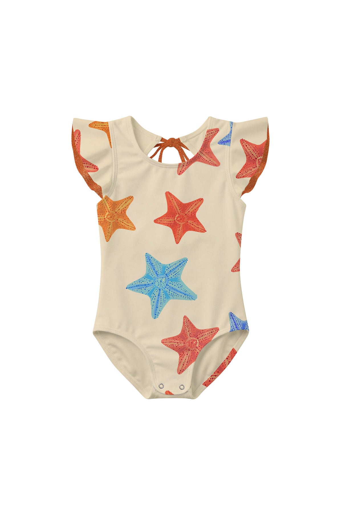 Vestido de baño enterizo paa bebé con nuestras llamativas mangas con vuelo! Abertura en la espalda con amarre. Diseñado con broches en la parte inferior para facilitar el cambio de pañal.  Hecho en Colombia