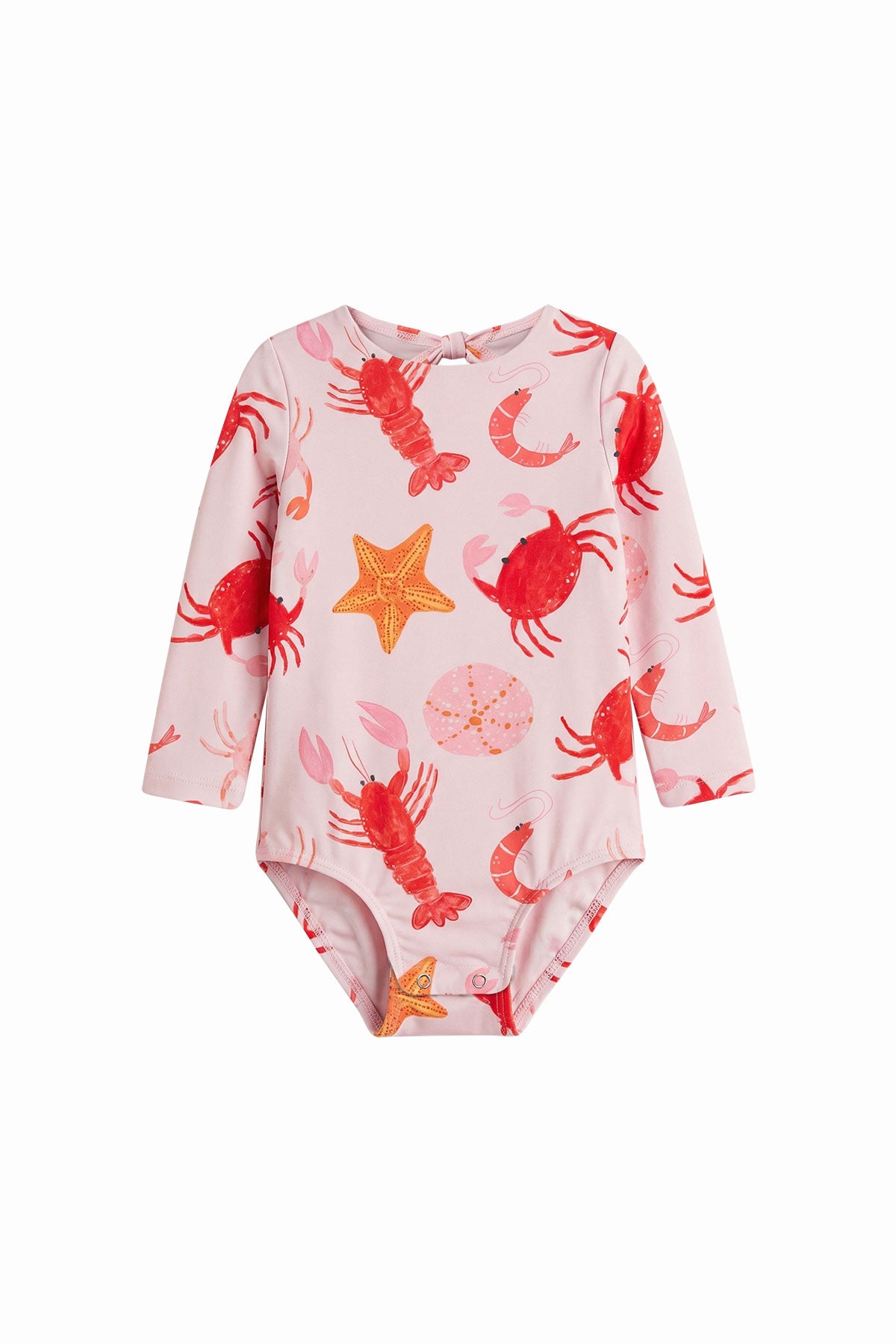 Traje de baño entero para bebé con mangas largas, diseñado para brindar comodidad y protección solar. Cuenta con un estampado completo y tela con protección UV 50+ para ayudar a proteger la piel delicada. Diseñado con broches en la parte inferior para facilitar el cambio de pañal. Pensado para un ajuste seguro y uso cómodo dentro y fuera del agua.