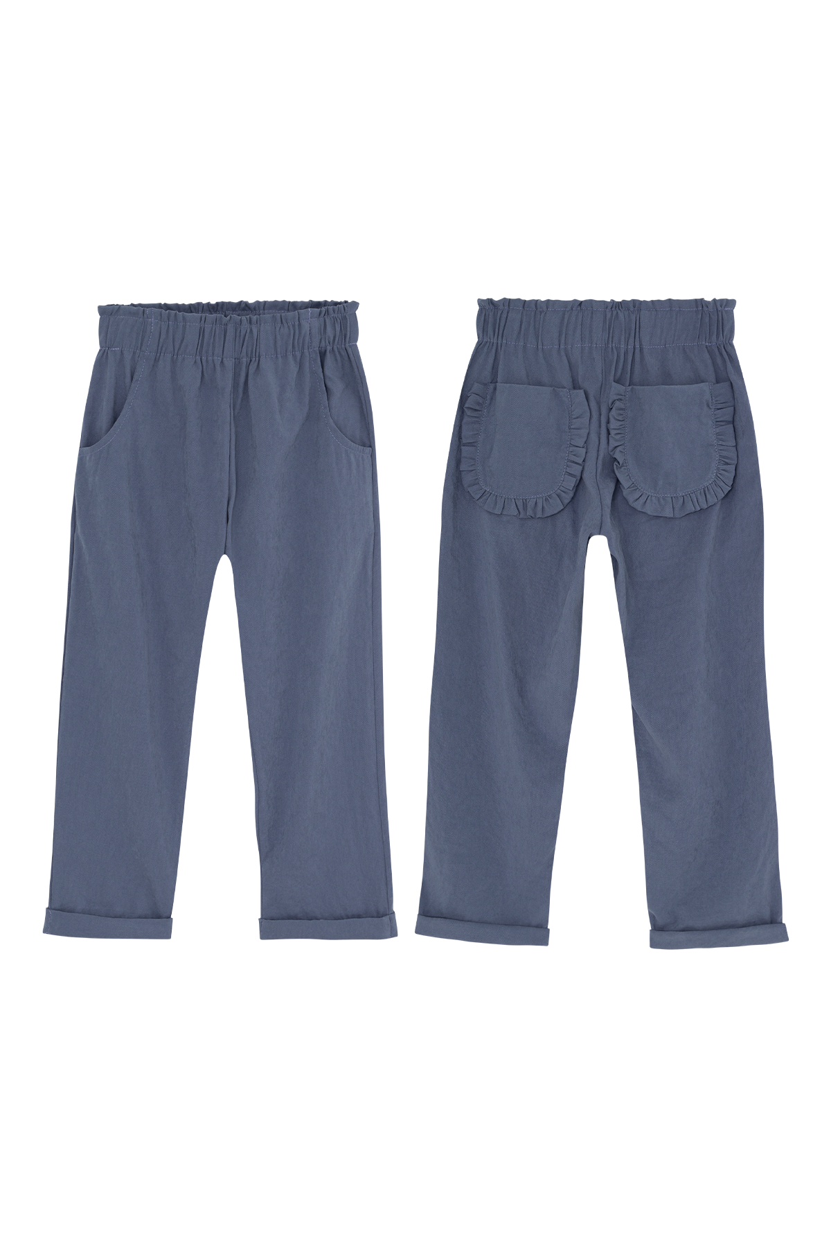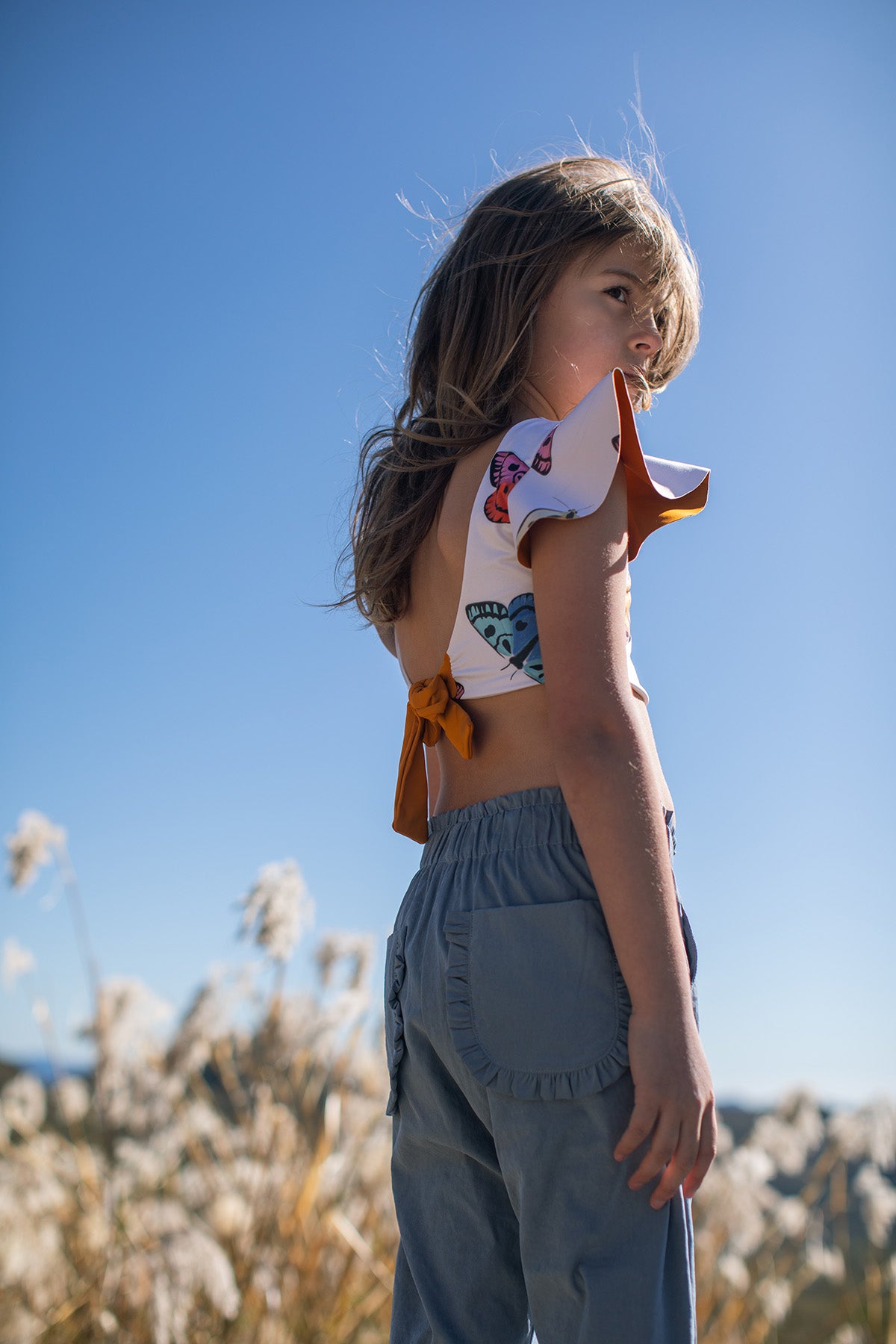 Pantalón infantil de corte ancho confeccionado en tela extra suave y ligera, ideal para garantizar libertad de movimiento y comodidad durante todo el día. Cuenta con dos bolsillos traseros decorados con arandela alrededor, y cintura encauchada que se ajusta perfectamente sin apretar. Diseño versátil que combina fácilmente con camisetas o sacos o mejor aún con nuestros bikinis y vestidos de baño! Perfecto para uso diario, colegio, viajes o actividades al aire libre.