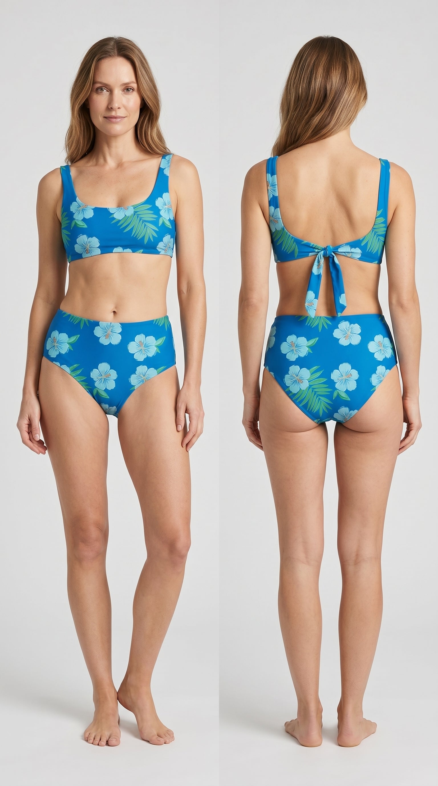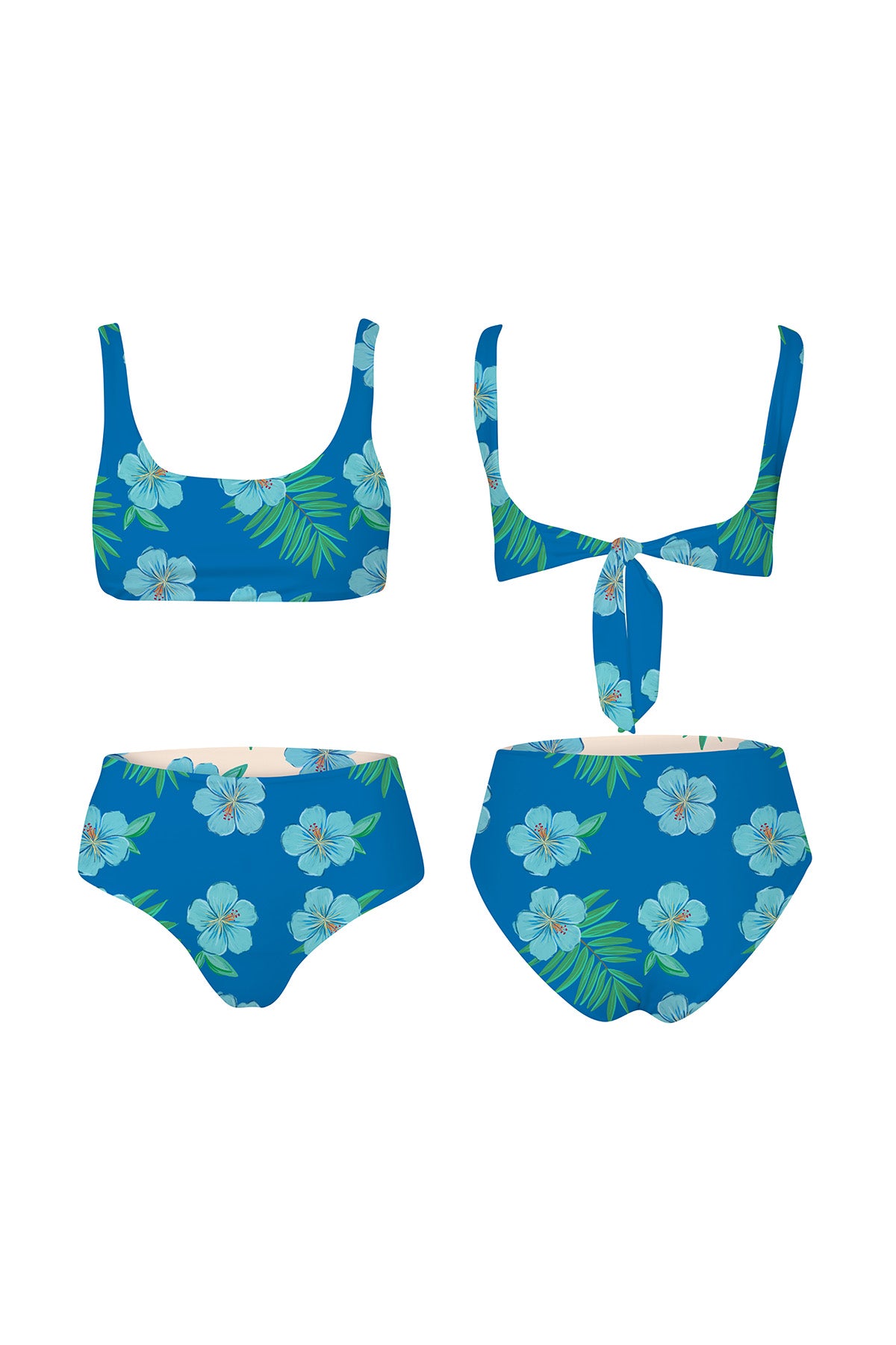 Este bikini de dos piezas para adulto presenta un top tipo crop con cuello redondo y cargaderas anchas para un soporte firme. La parte posterior del top incluye un detalle de nudo ajustable para regular el contorno. La parte inferior es de tiro alto con una silueta clásica de cubrimiento medio. El estampado muestra flores de hibisco y hojas tropicales en tonos azul claro y verde sobre un fondo azul oscuro.