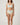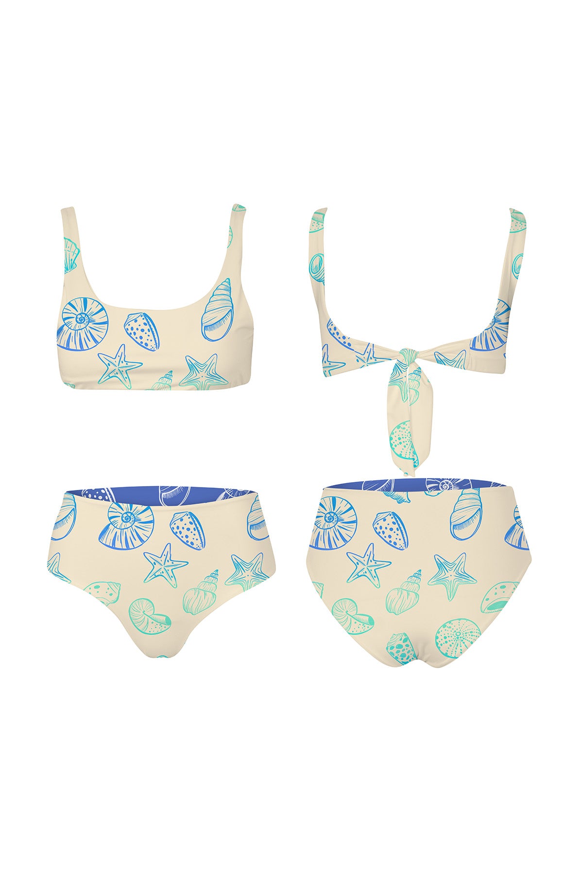 Este bikini de dos piezas para adulto presenta un top tipo crop con cuello redondo y cargaderas anchas para un soporte firme. La parte posterior del top incluye un detalle de nudo ajustable para regular el contorno. La parte inferior es de tiro alto con una silueta clásica de cubrimiento medio. El estampado muestra ilustraciones lineales de caracoles y estrellas de mar en tonos azules y turquesas sobre un fondo crema.