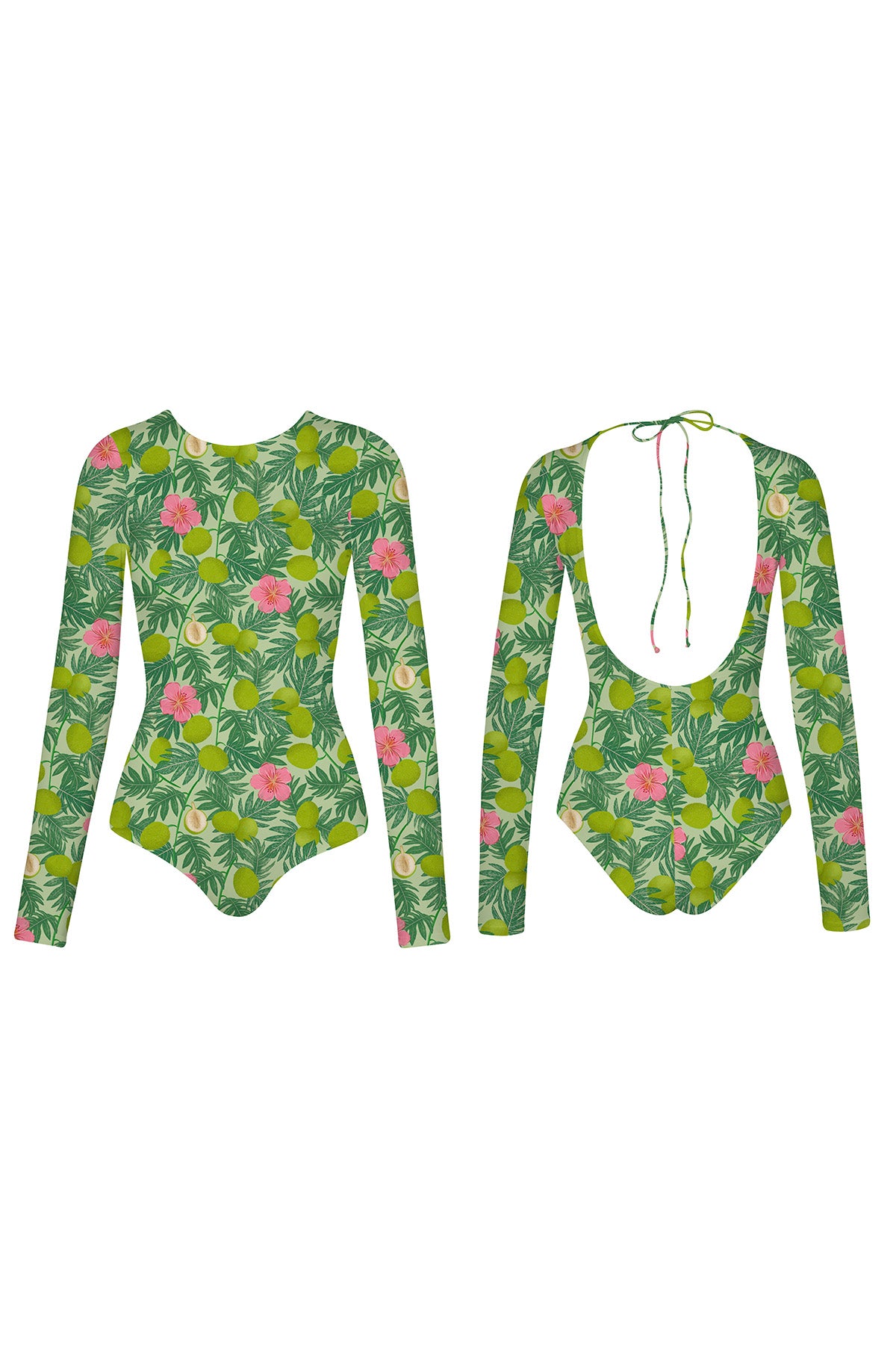 Vestido de baño de una sola pieza con mangas largas y espalda abierta. Cuenta con escote redondo en el frente y espalda profunda con amarre ajustable.