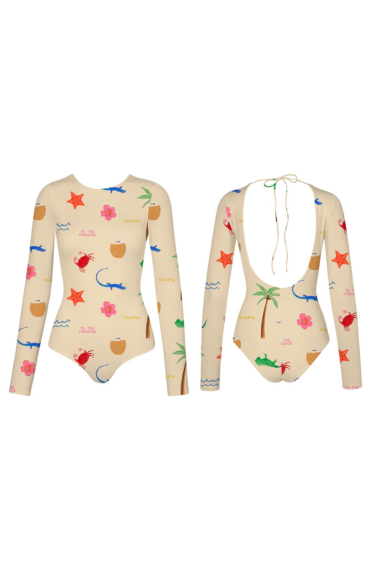 Vestido de baño de una sola pieza con mangas largas y espalda abierta. Cuenta con escote redondo en el frente y espalda profunda con amarre ajustable.