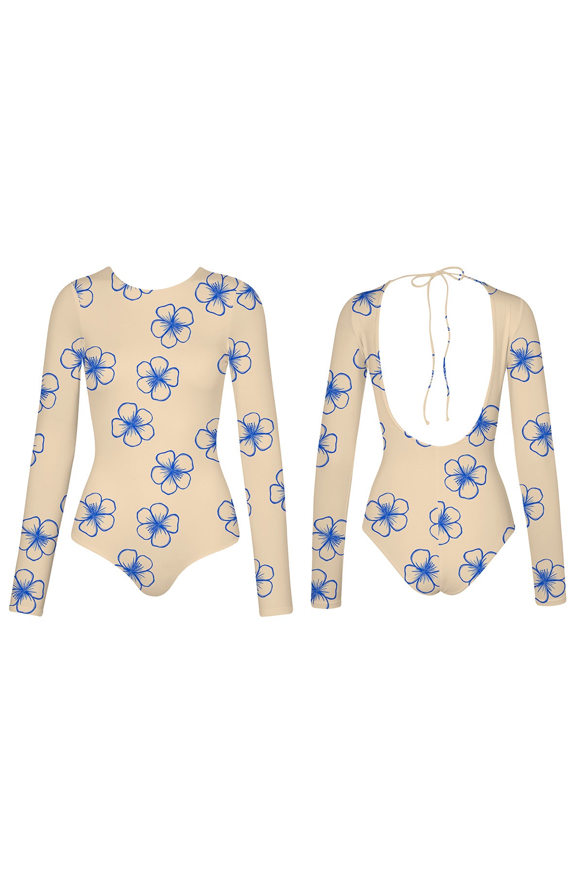 Vestido de baño de una sola pieza con mangas largas y espalda abierta. Cuenta con escote redondo en el frente y espalda profunda con amarre ajustable.