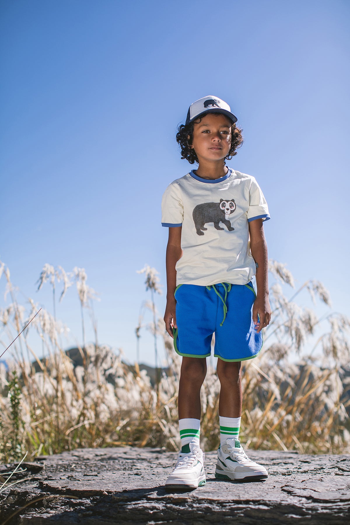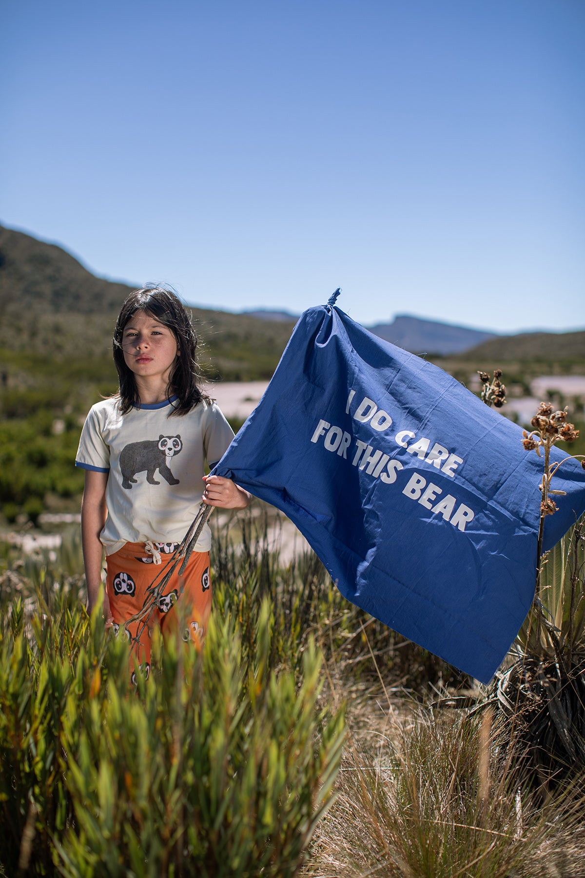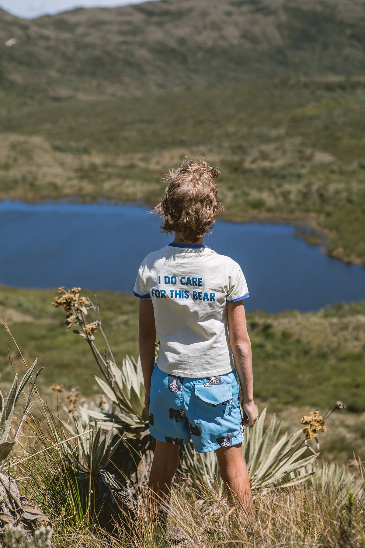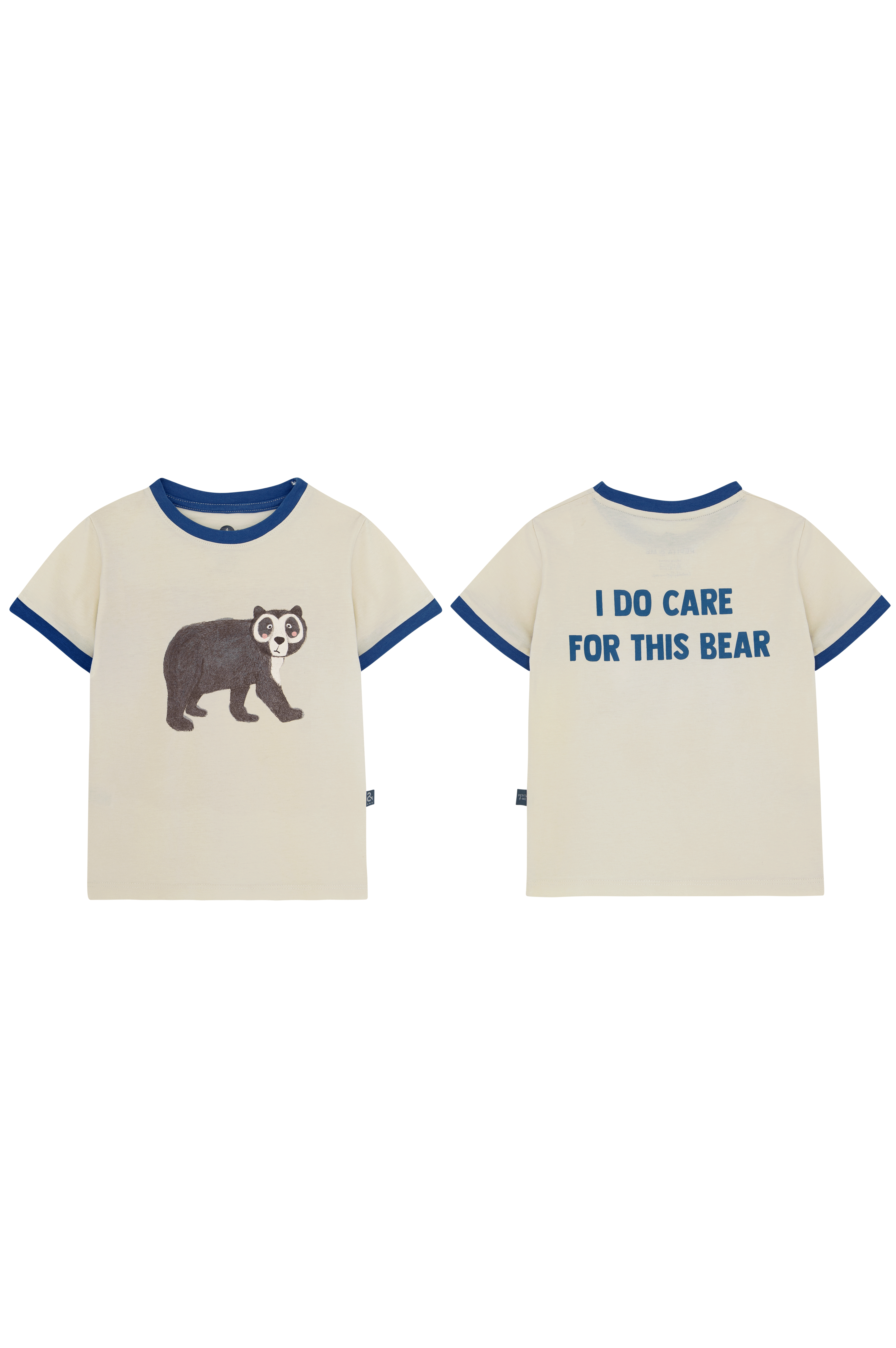 Camiseta infantil de manga corta confeccionada en 100% algodón suave y transpirable, ideal para pieles delicadas. Presenta en la parte frontal un estampado de oso de anteojos y en la parte trasera el mensaje en inglés "I DO CARE FOR THIS BEAR", fomentando el cuidado de la naturaleza y los animales. Con cuello y puños en contraste color azul para un toque moderno y divertido. Perfecta para uso diario, colegio, paseos o actividades al aire libre. Hecha en Colombia.