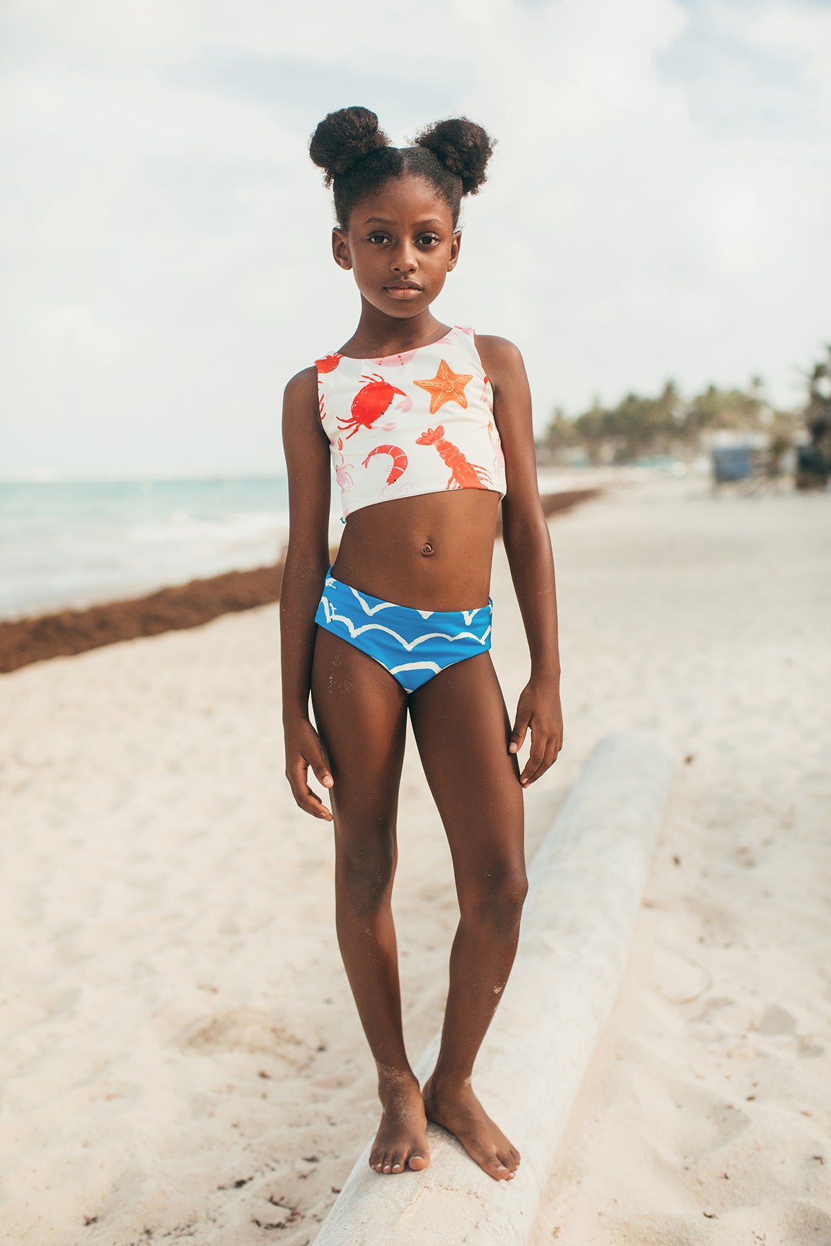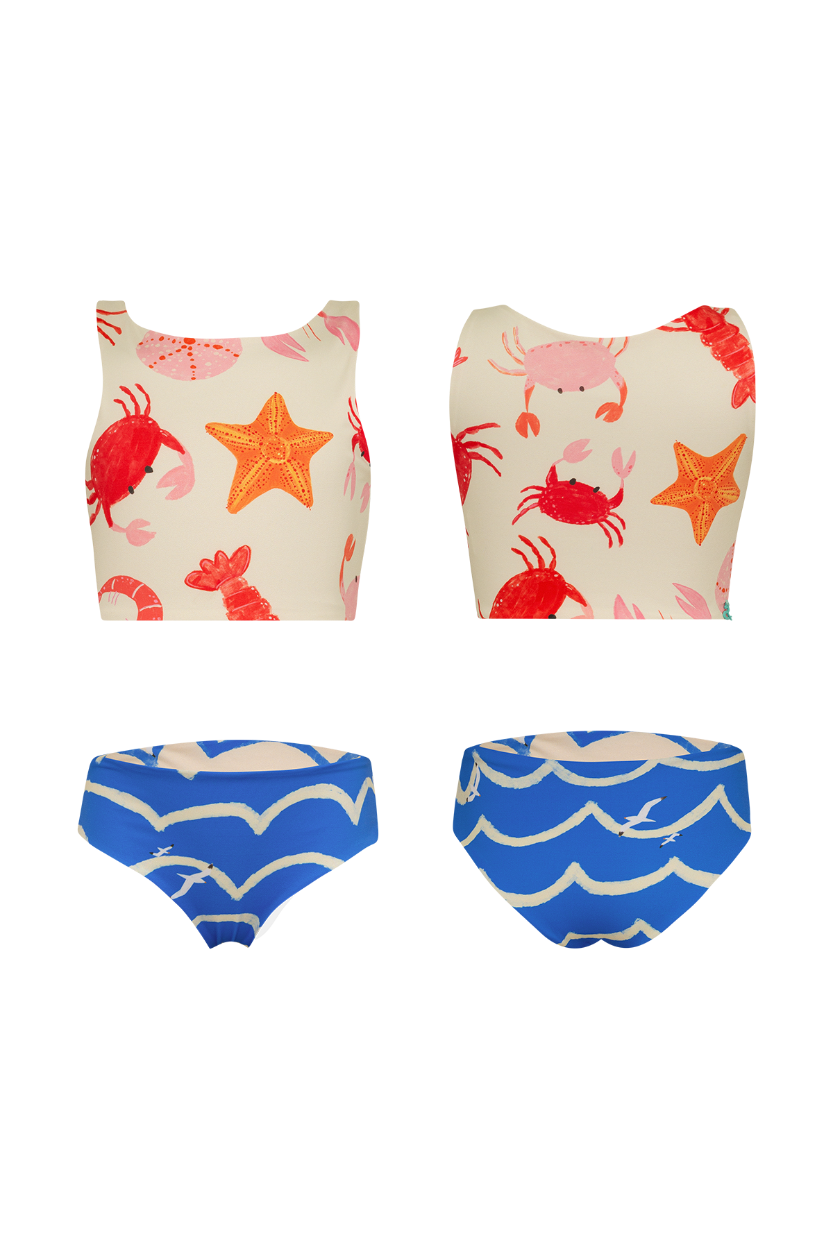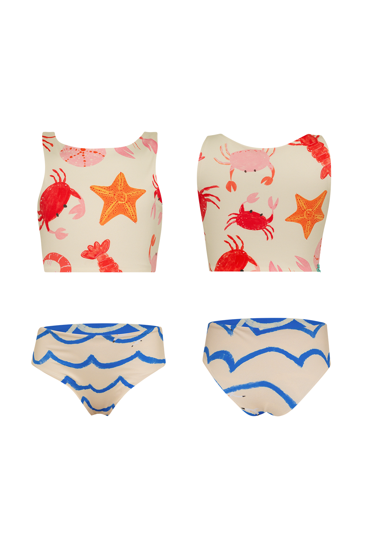 Bikini de dos piezas para niñas. El top presenta un estampado marino con cangrejos, estrellas de mar y conchas sobre fondo claro.